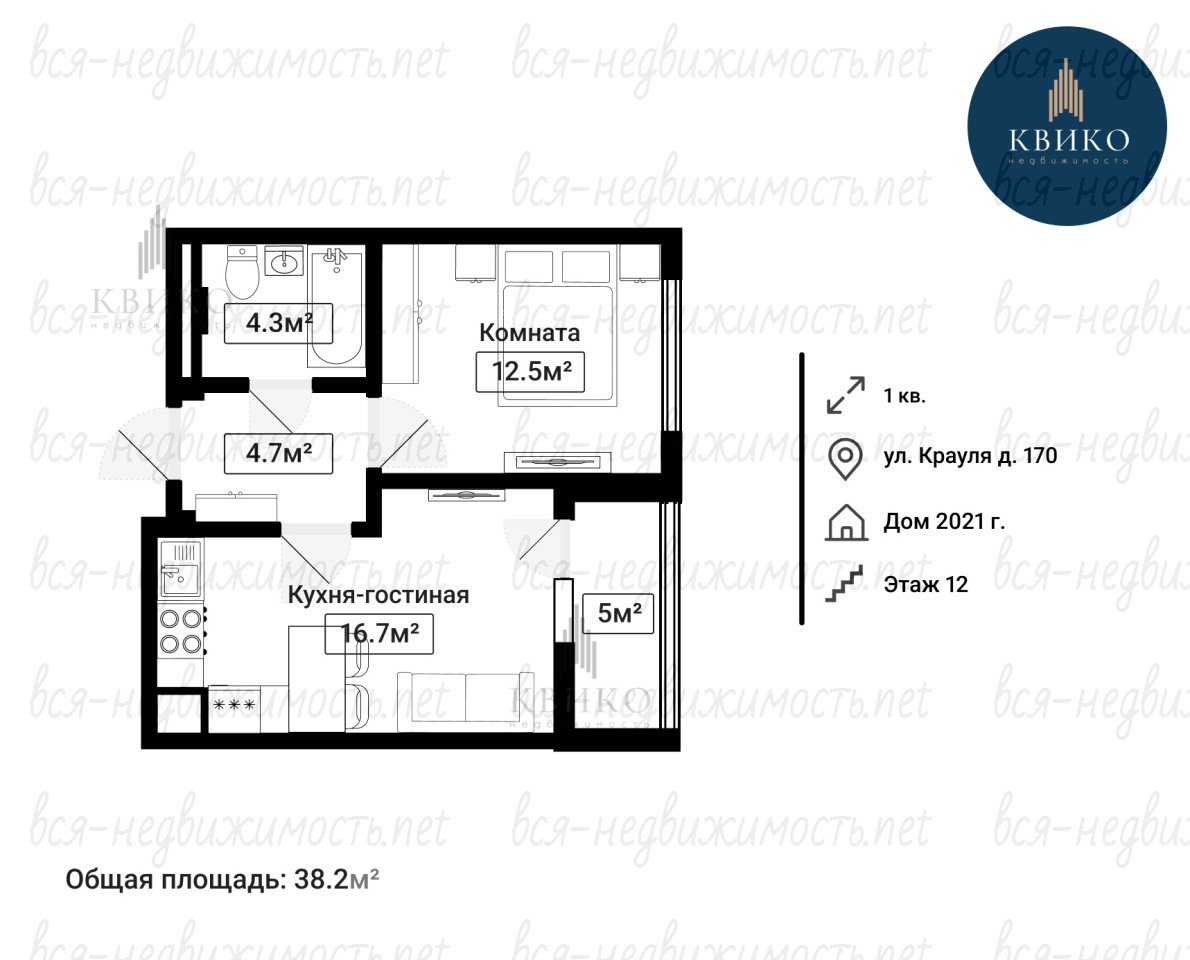 - общая площадь 38,2 м2, кухня-столовая 16,7 м2, комната - 12,5 м2, балкон