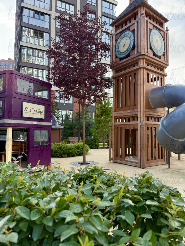 Зеленый двор: Эко-система во дворе с необычными растениями, деревьями, искусственным ручьем, многочисленными игровыми площадками.
