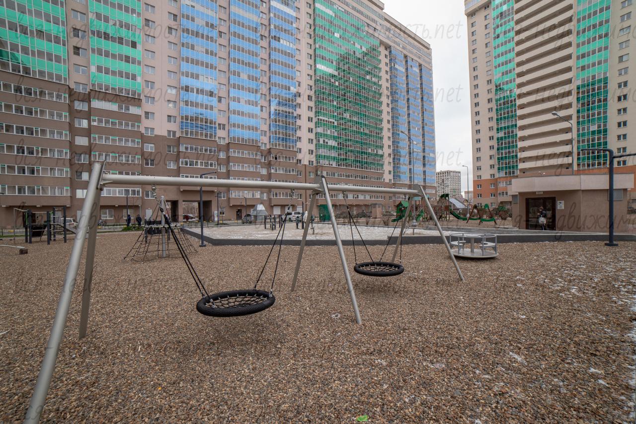 Большой закрытый двор с ландшафтным дизайном, газонами, детскими и спортивными площадками для игр и отдыха.
