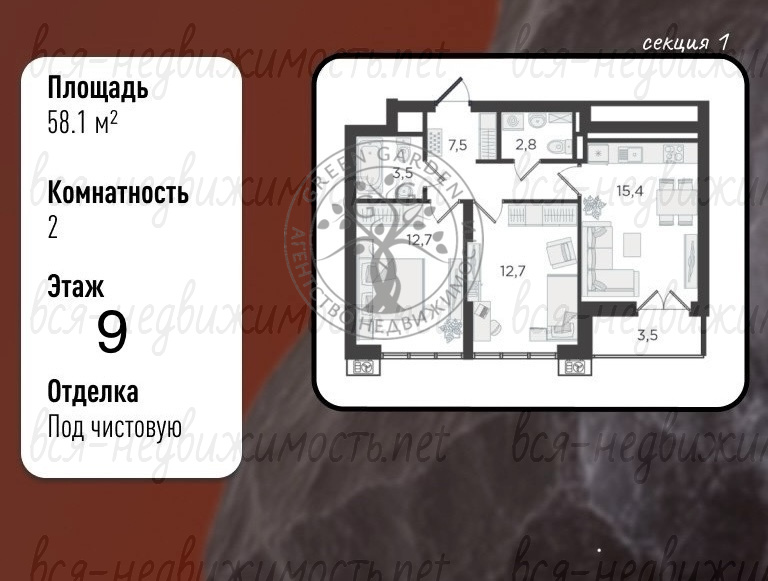 • Общая площадь: 58.1 м²