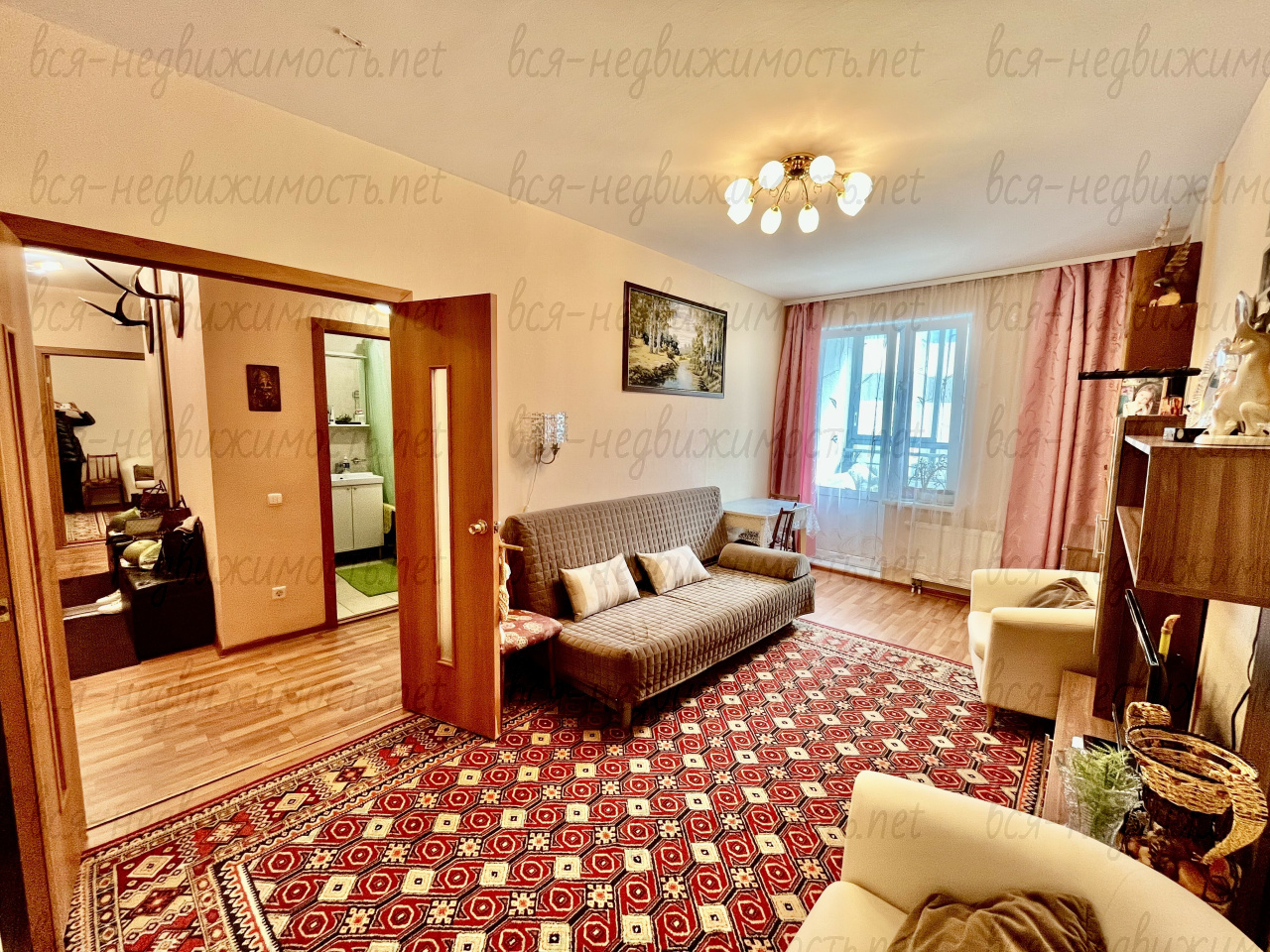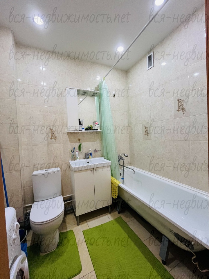 -сан узел в кафельной плитке, спокойный ремонт от застройщика, обои под покраску и ламинат