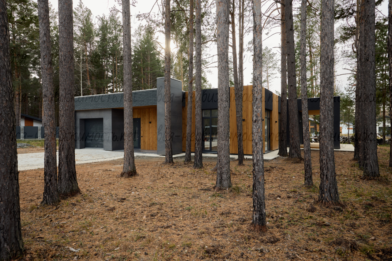 На участке сделан дренаж. Постарались сохранить максимальное количество сосен возле дома.