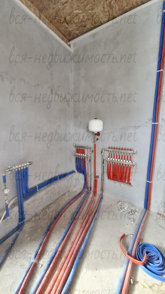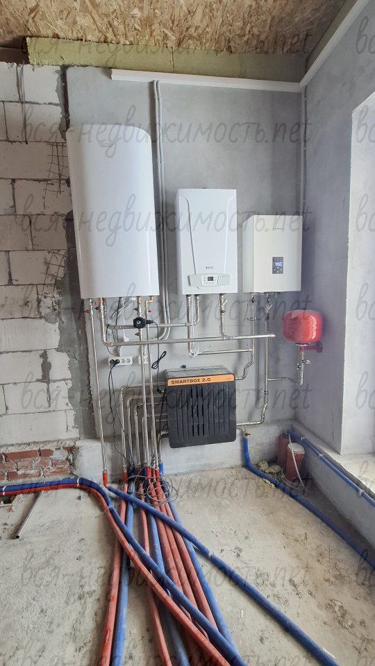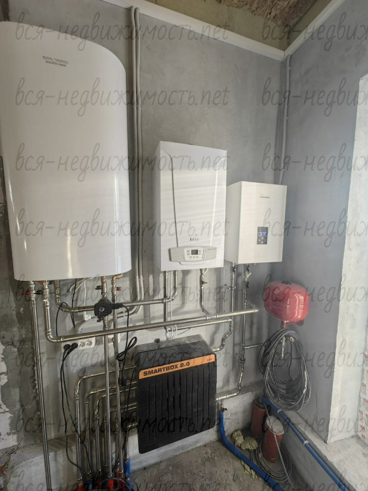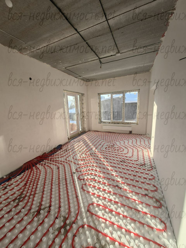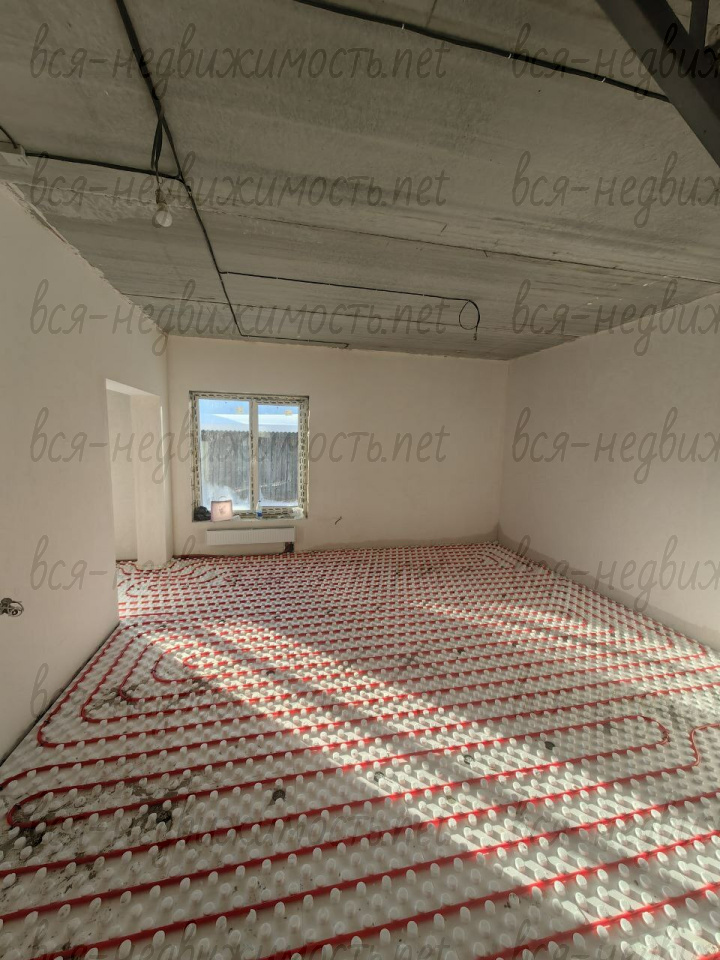 В доме 4 комнаты, кухня, гостиная, два санузла, гараж, центральное водоснабжение, канализация, газоснабжение. Отделка «под чистовую», стены отштукатурены, полы залиты, теплые полы, радиаторы, отопление от газового котла. Пять полноценных комнат + кухня, гостиная, гараж и земельный участок.