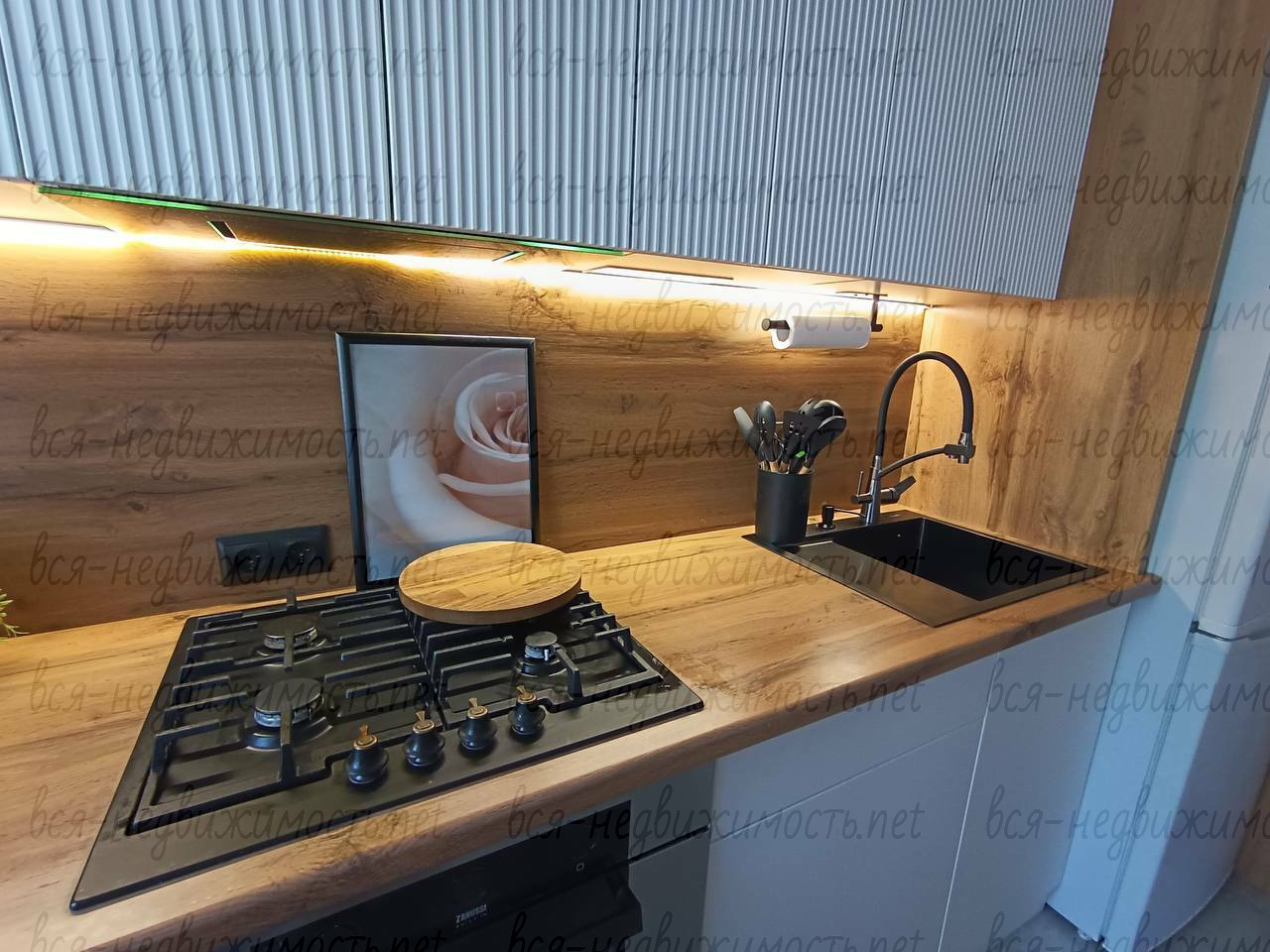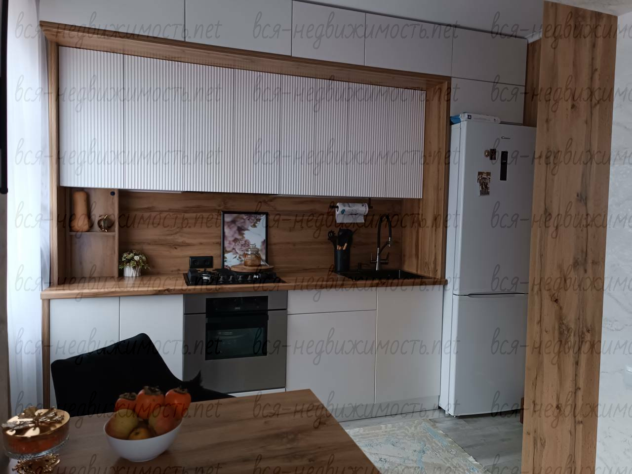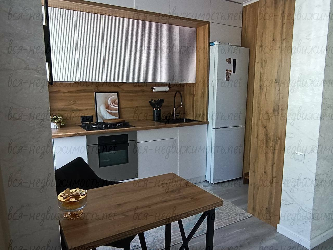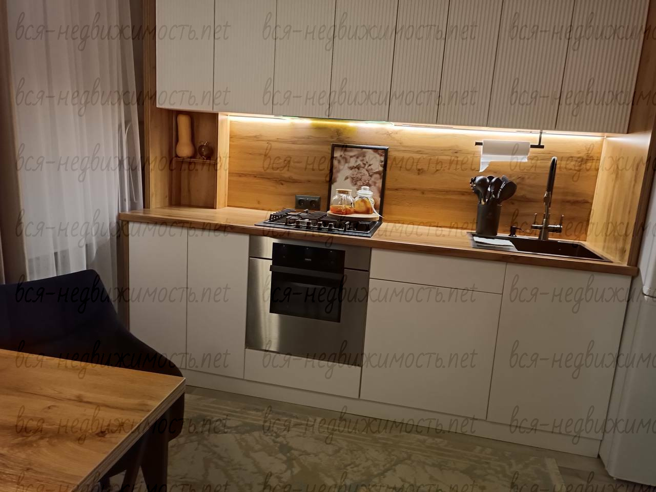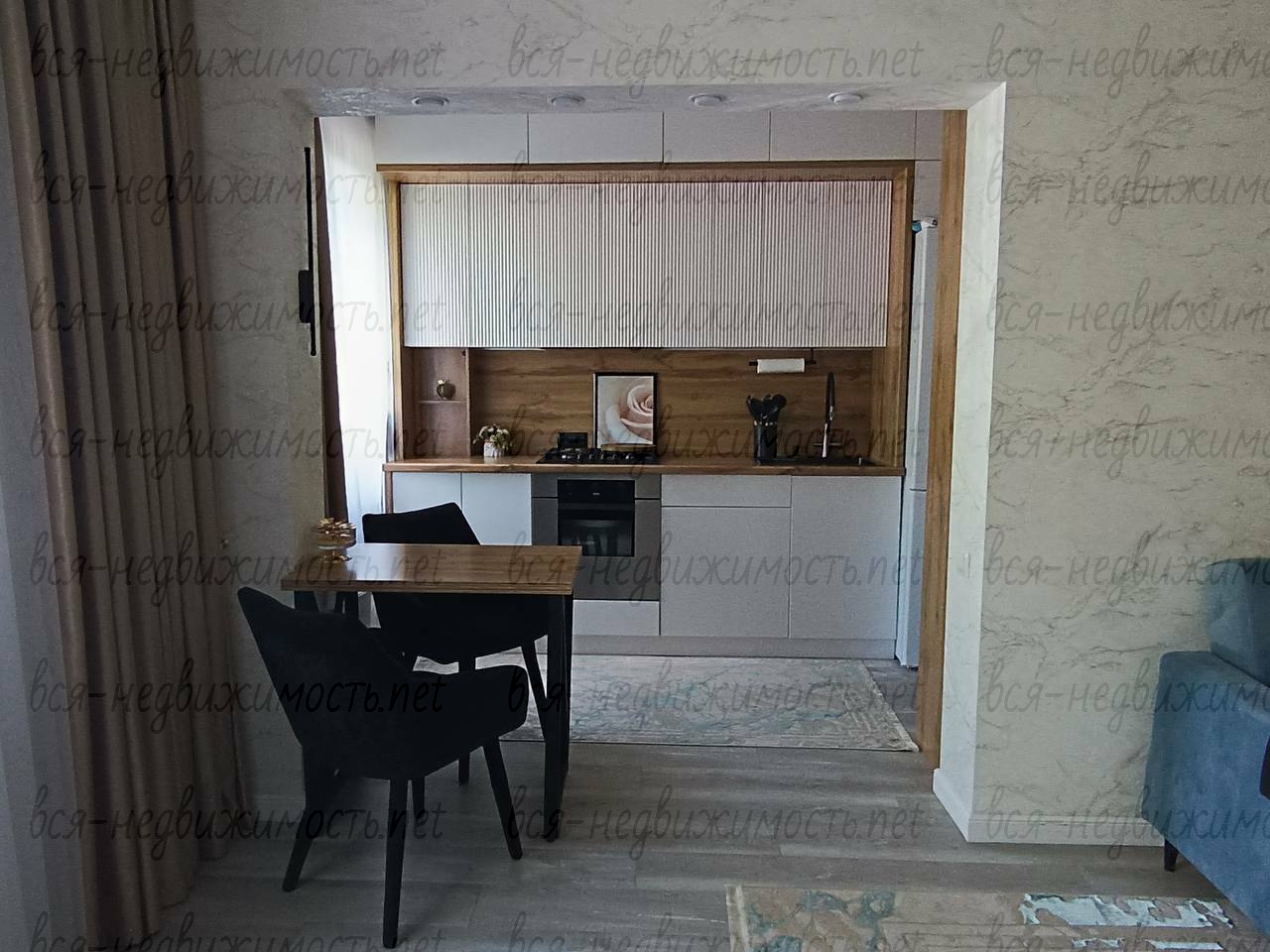 Кухня - встроенный гарнитур по индивидуальному заказу со встроенной подсветкой. Из техники - варочная поверхность газовая, духовка электрическая, холодильник, стиральная машина, микроволновая печь, термопот, встроенная вытяжка, встроенные розетки. Столик для завтраков изготовлен на заказ. Дизайнерские стулья.