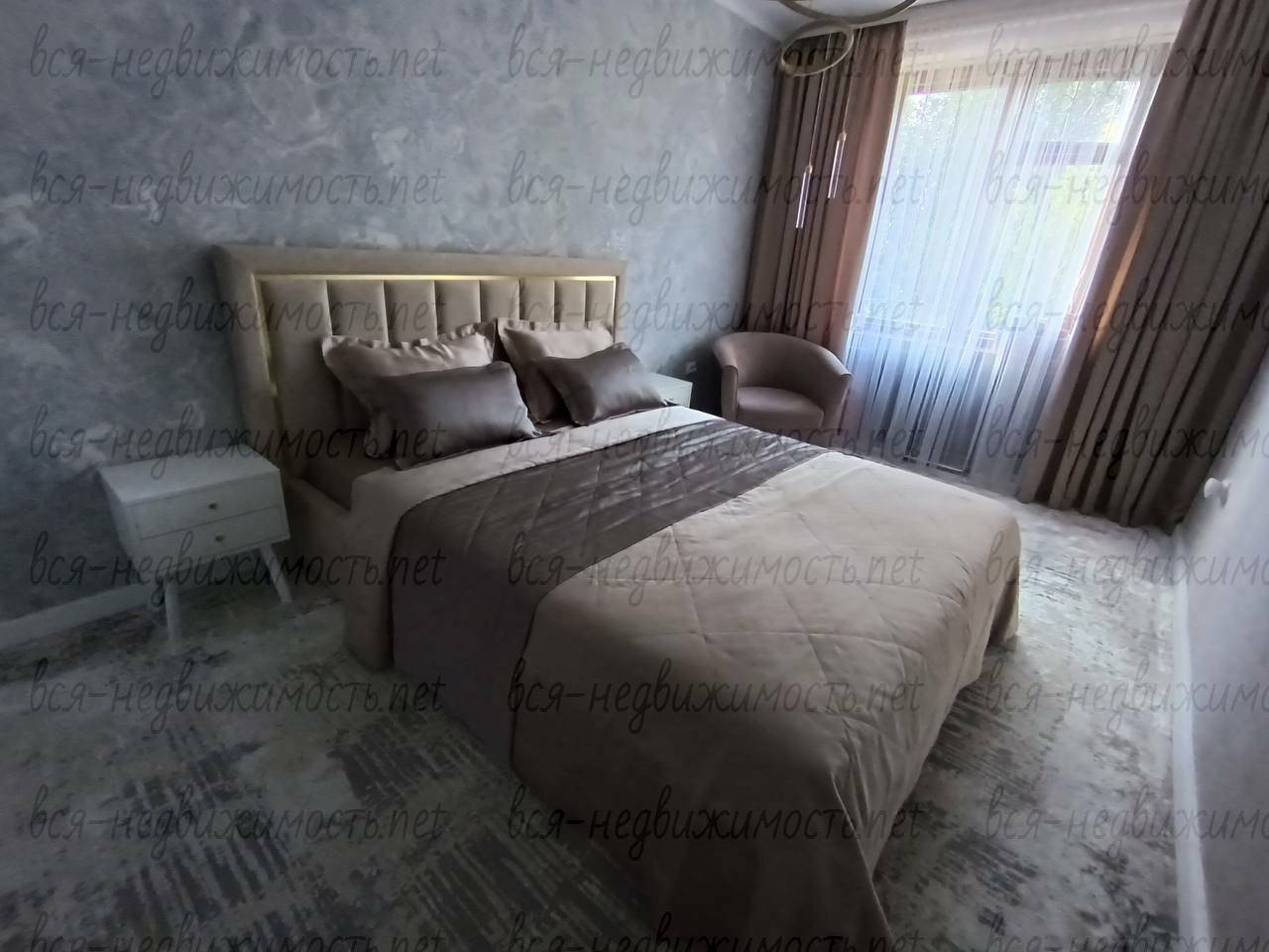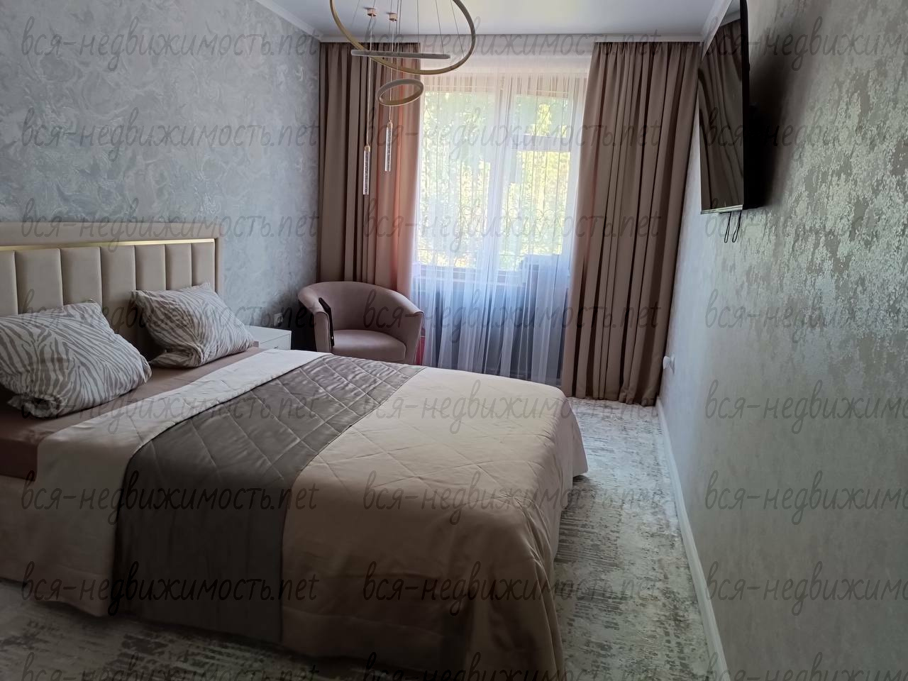Спальня - гардеробный шкаф по индивидуальному заказу, кровать с подъемным механизмом (на газлифтах) с местом для хранения по площади всей кровати, ортопедический матрас. Телевизор. На полу турецкое шелковое ковровое покрытие.