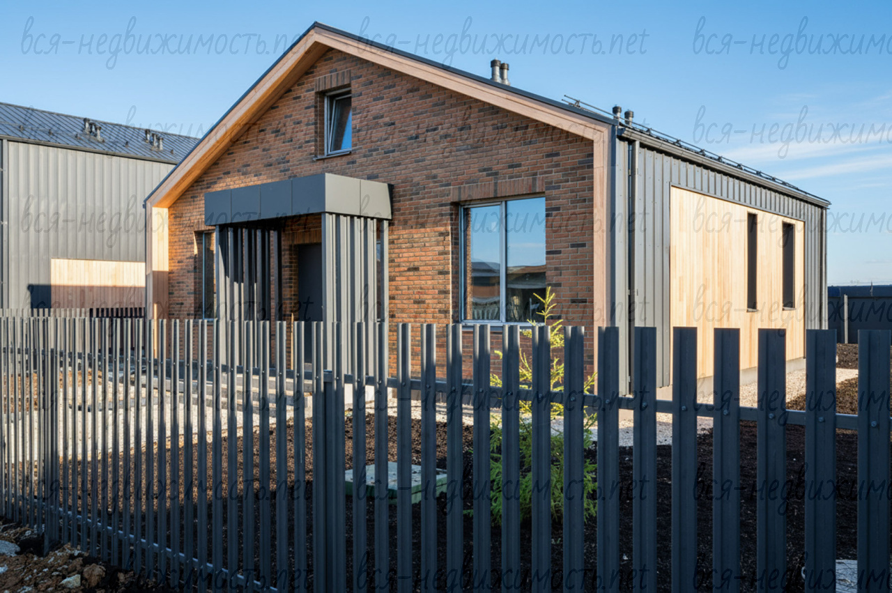 Фасад: Вентилируемый. Комбинированные материалы (кирпич, планкен лиственницы класса Экстра, профнастил с имитацией фальца)