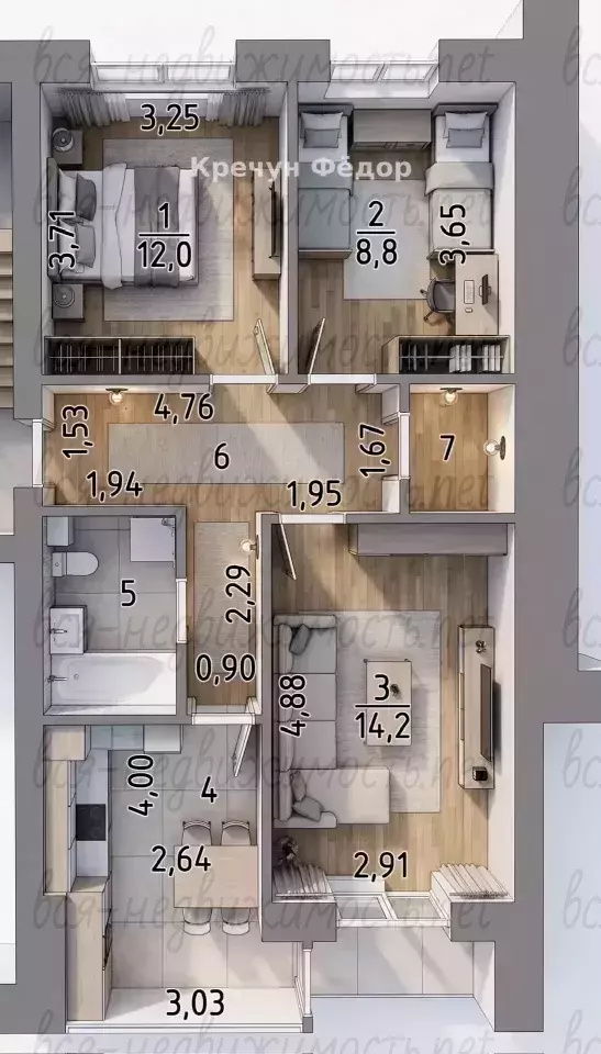 Семье с двумя детьми (каждому по комнате), большой семье, а также тем, кто ценит удобную инфраструктуру и вид на парк