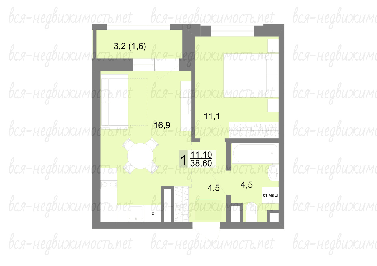 Отличная планировка: кухня-гостиная. и уютная спальня.