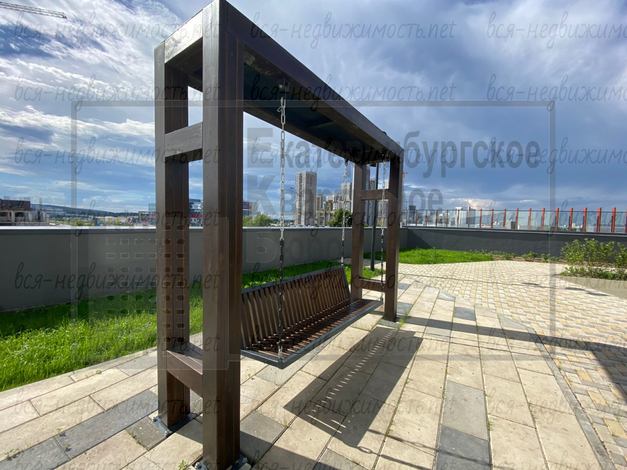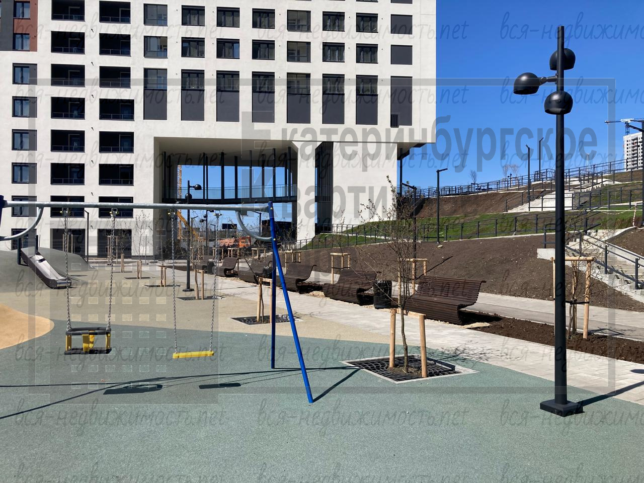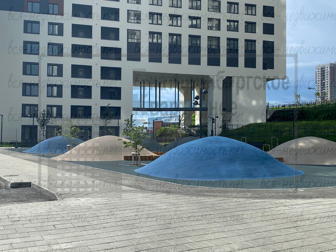 Закрытый для посторонних, многоуровневый двор с детскими и спортивными площадками и зелеными зонами.