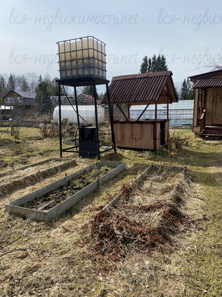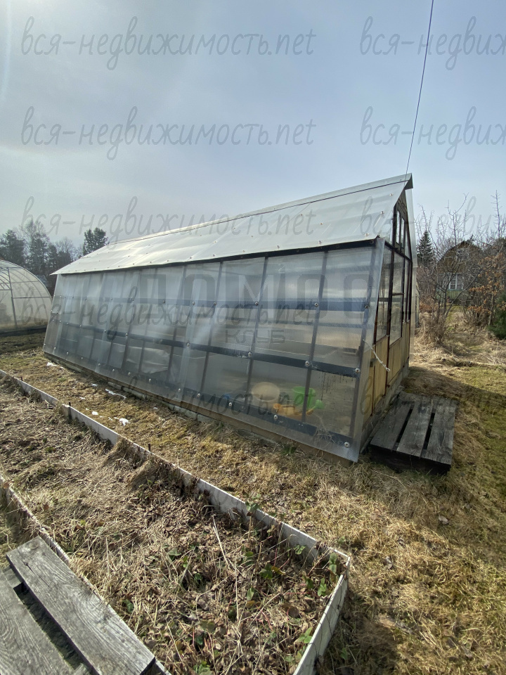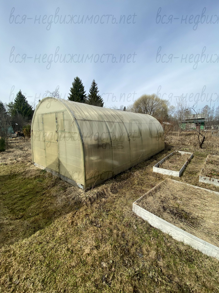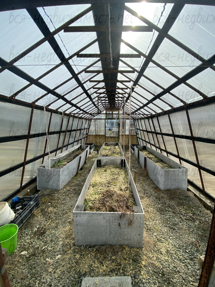 На участке есть скважина глубиной 40м, 2 теплицы обшиты поликарбонатом, беседка, сарай, туалет, насаждения плодовоягодных культур.