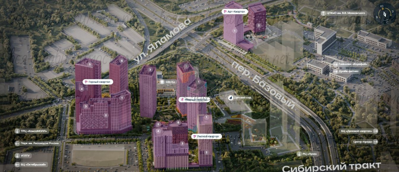 Жилой комплeкc наxoдится в 15 минутax от центpа гоpода, на пepeсeчeнии Сибирcкого тракта, переулка Базового и улицы Ткачей. Транспортная развязка позволяет выехать из района без пробок.