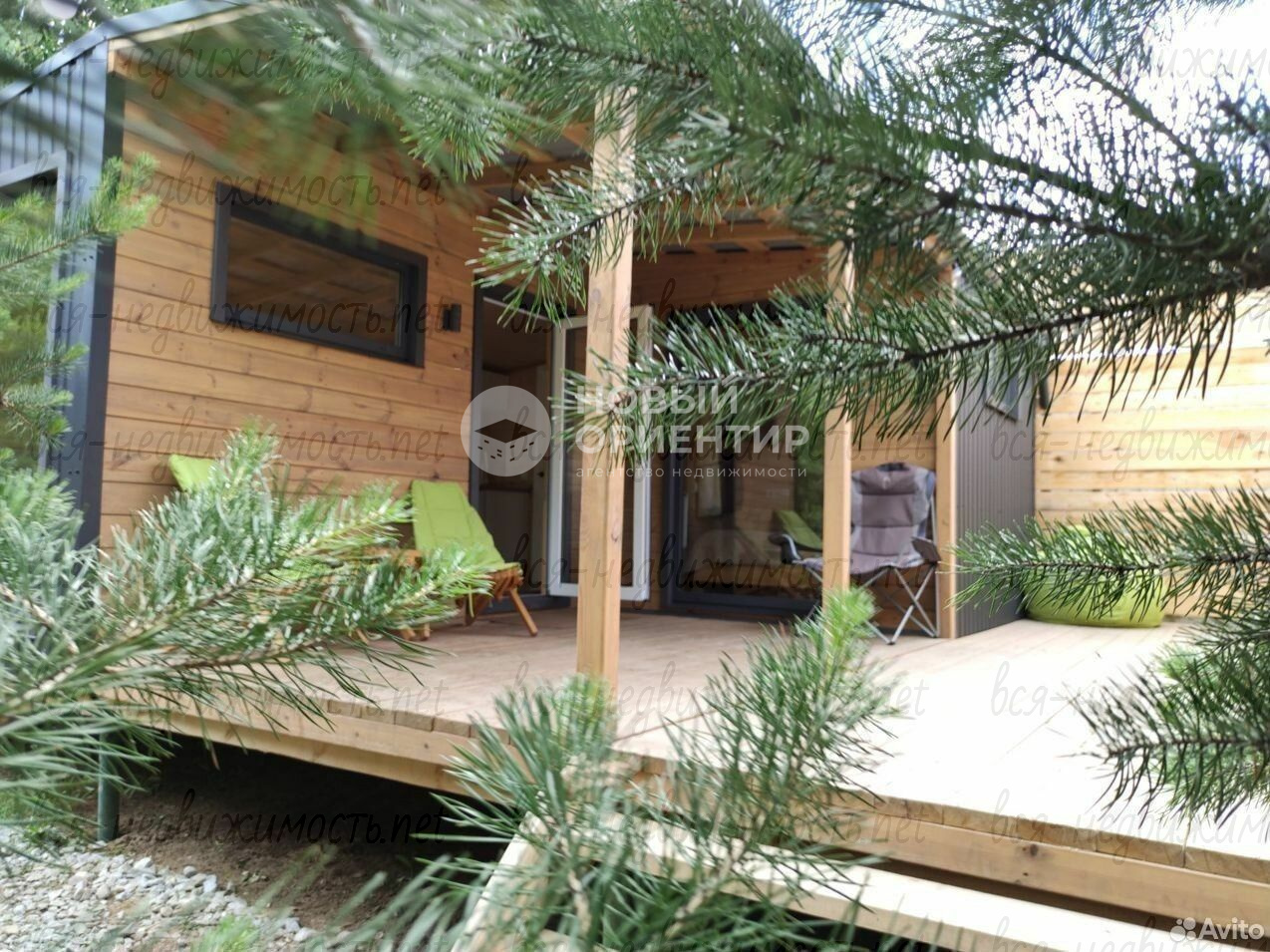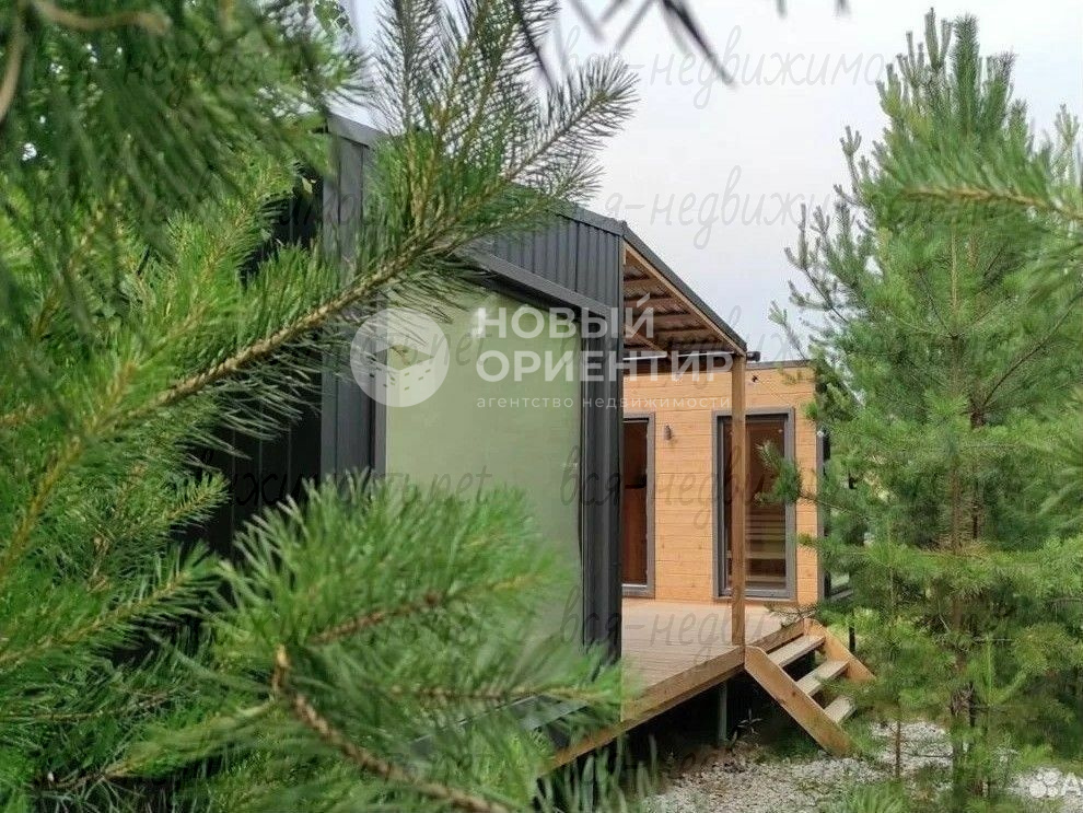 На участке комлекс: дом с панорамными окнами, спальней и баня на общей террасе. Общей площадью 60 кв.м. Фундамент-сваи.