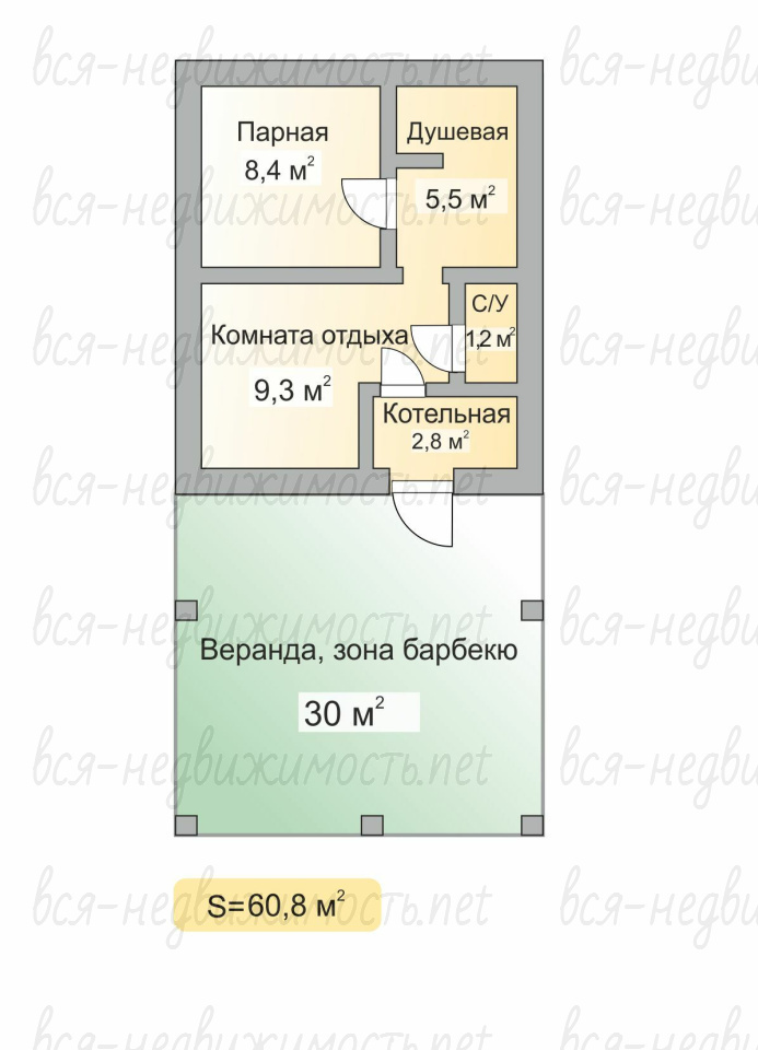 - Терраса 30 м2 с зоной отдыха, кухонный уголком.