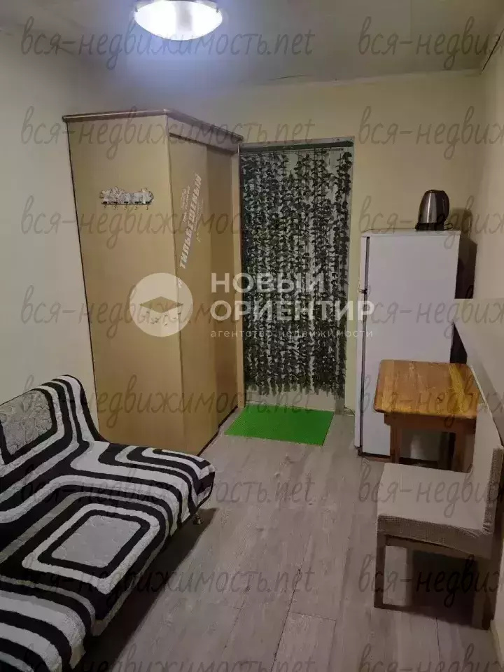 Комната полностью меблирована: диван, стол, стул, шкаф, холодильник, чайник.