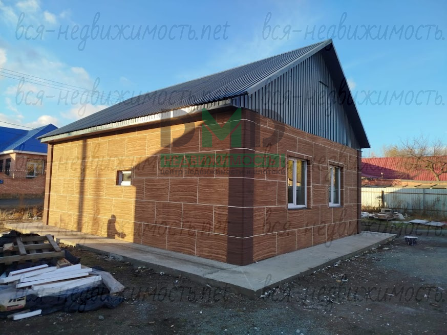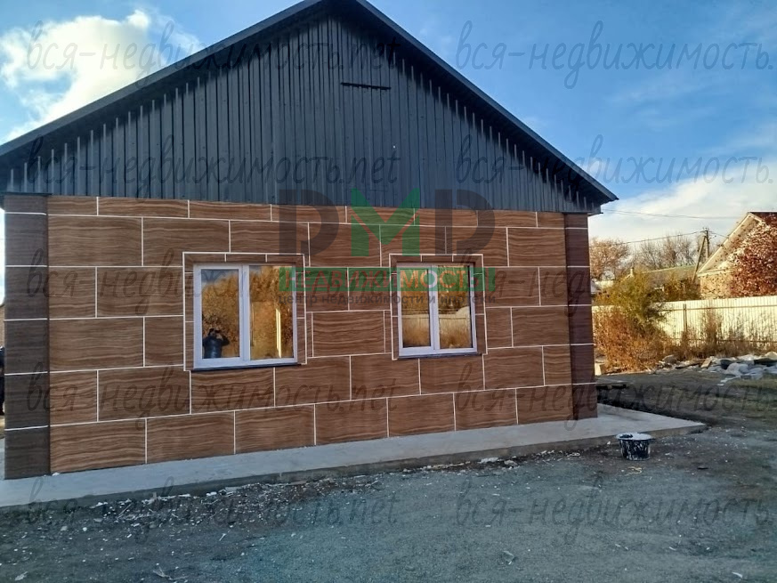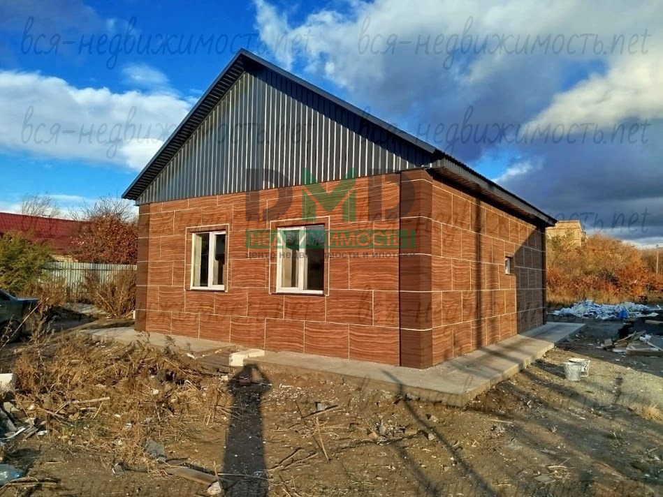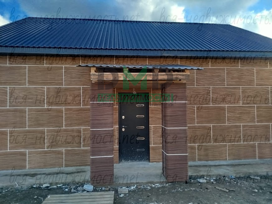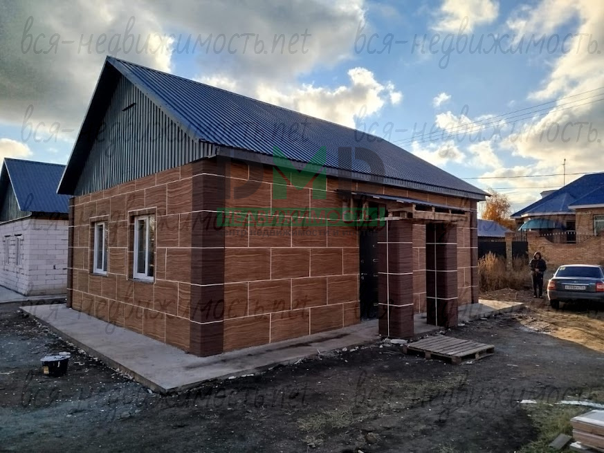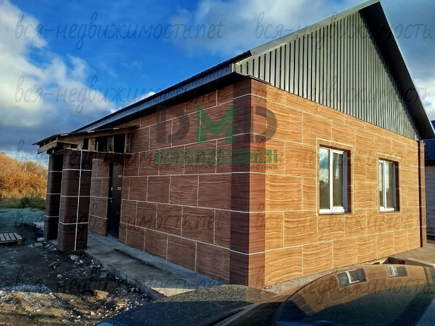 Дом построен из пеноблока, обшит термопанелями (теплее, чем кирпич), коммуникации газ и вода - центральные, канализация - септик, по всему дому - тёплые полы от котла, двухконтурный, проводка медная, стены - предчистовая, по уровню, пол выровнен и "выведен в ноль", вокруг дома залит бетонный отмосток. В плане - небольшое крыльцо и забор.