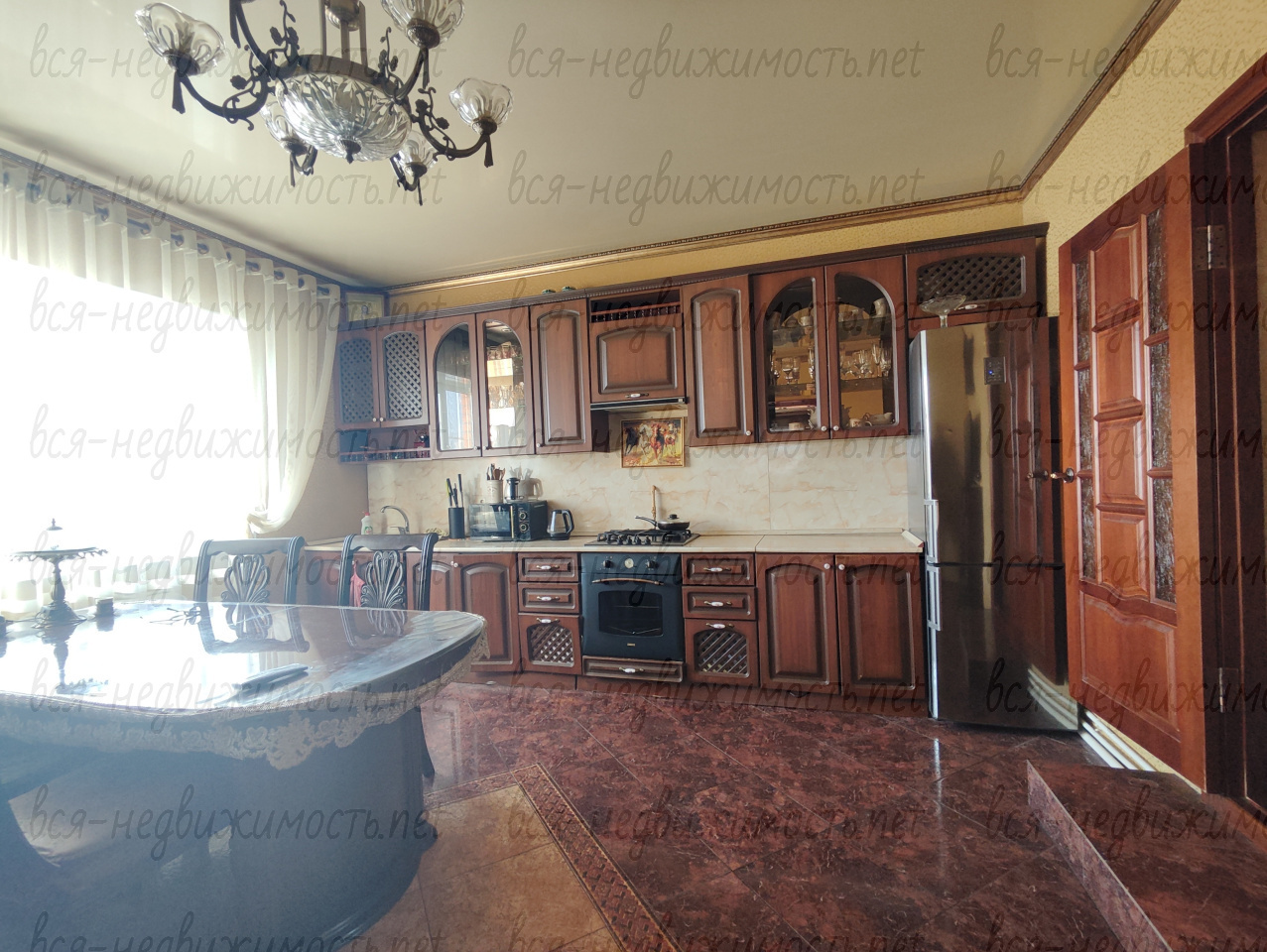 Из гостиной через широкий проём, с распашными дверями, попадаем на кухню с просторной обеденной зоной.