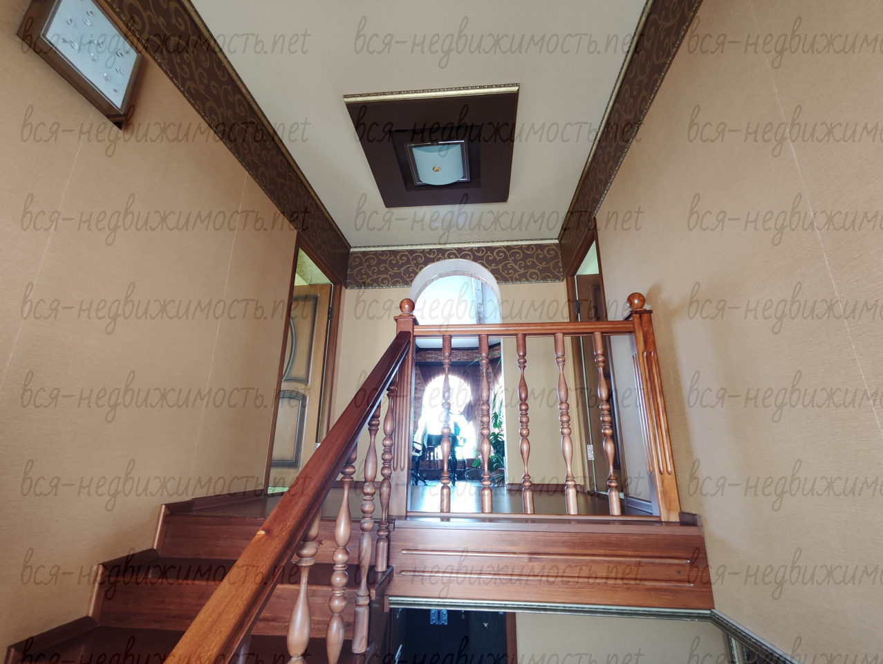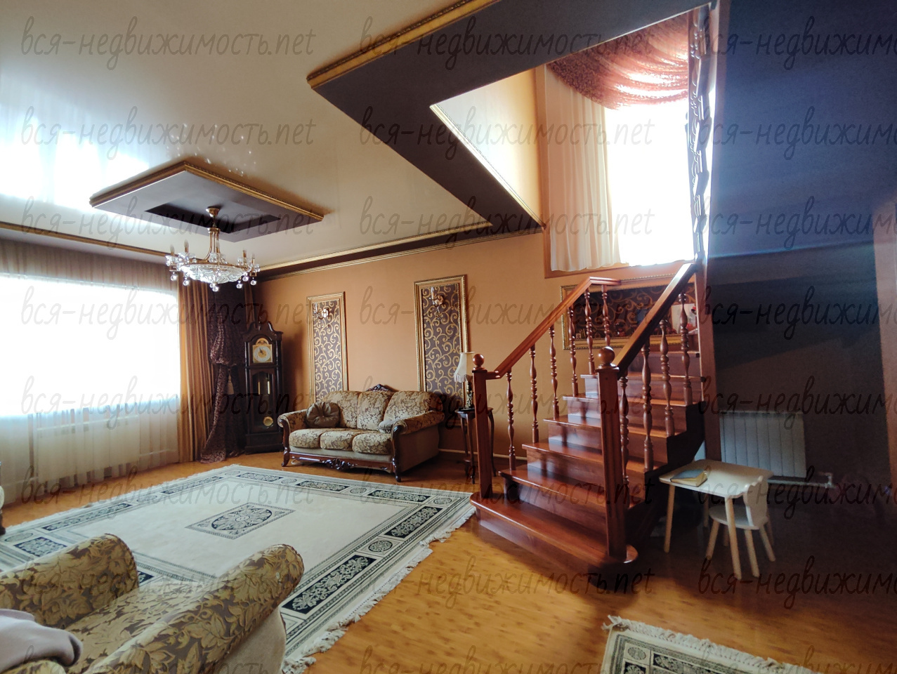 На второй этаж мы попадаем через добротную лакированную лестницу, с широкими удобными ступенями.