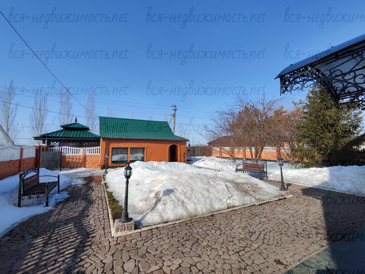 Дорожки вымощены камнем, газон, лавочки, деревья, вечерняя подсветка. Красивый забор, летний домик.