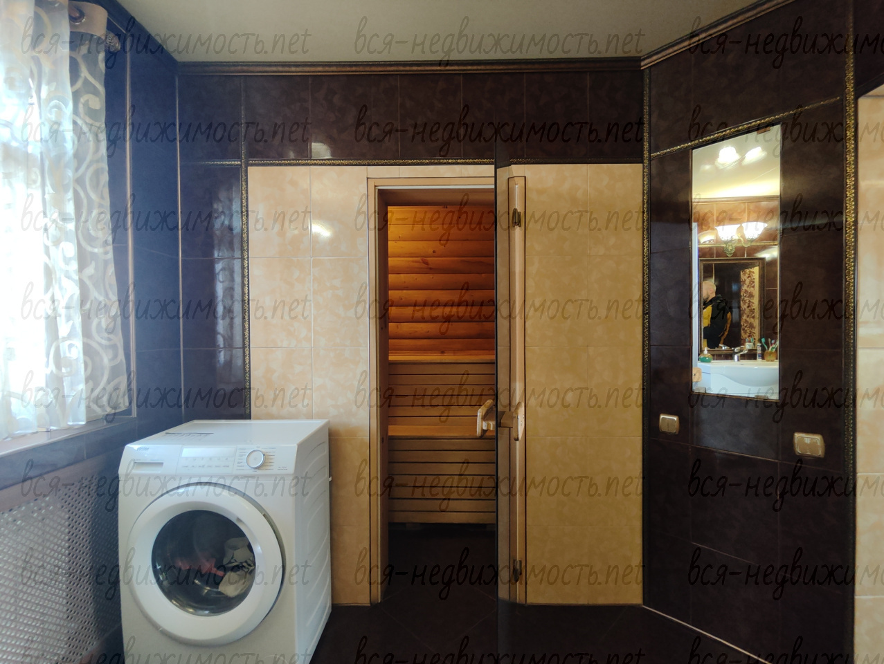 Там же рядом с кухней большая ванная комната гармонично совмещённая с сауной.
