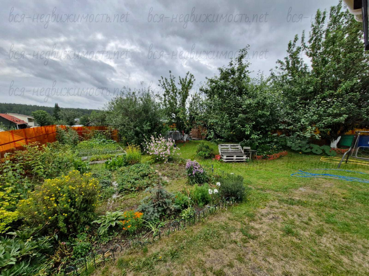 Сад огорожен по периметру прозрачным оранжевым профилированным поликарбонатом, высота 2м