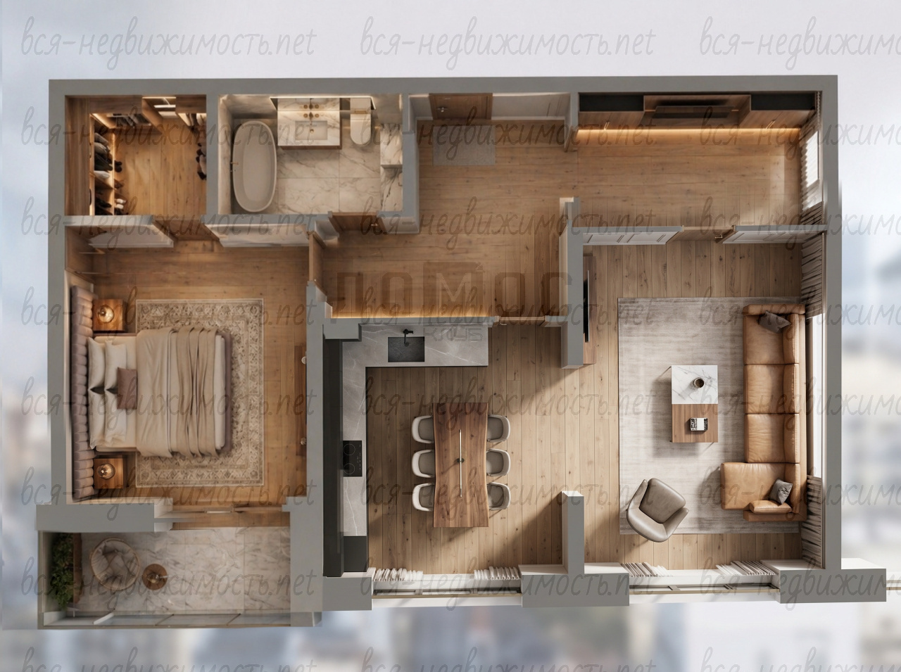 Особенно рекомендую обратить внимание на светлую кухню‑гостиную и вместительную гардеробную — такие детали встречаются нечасто!
