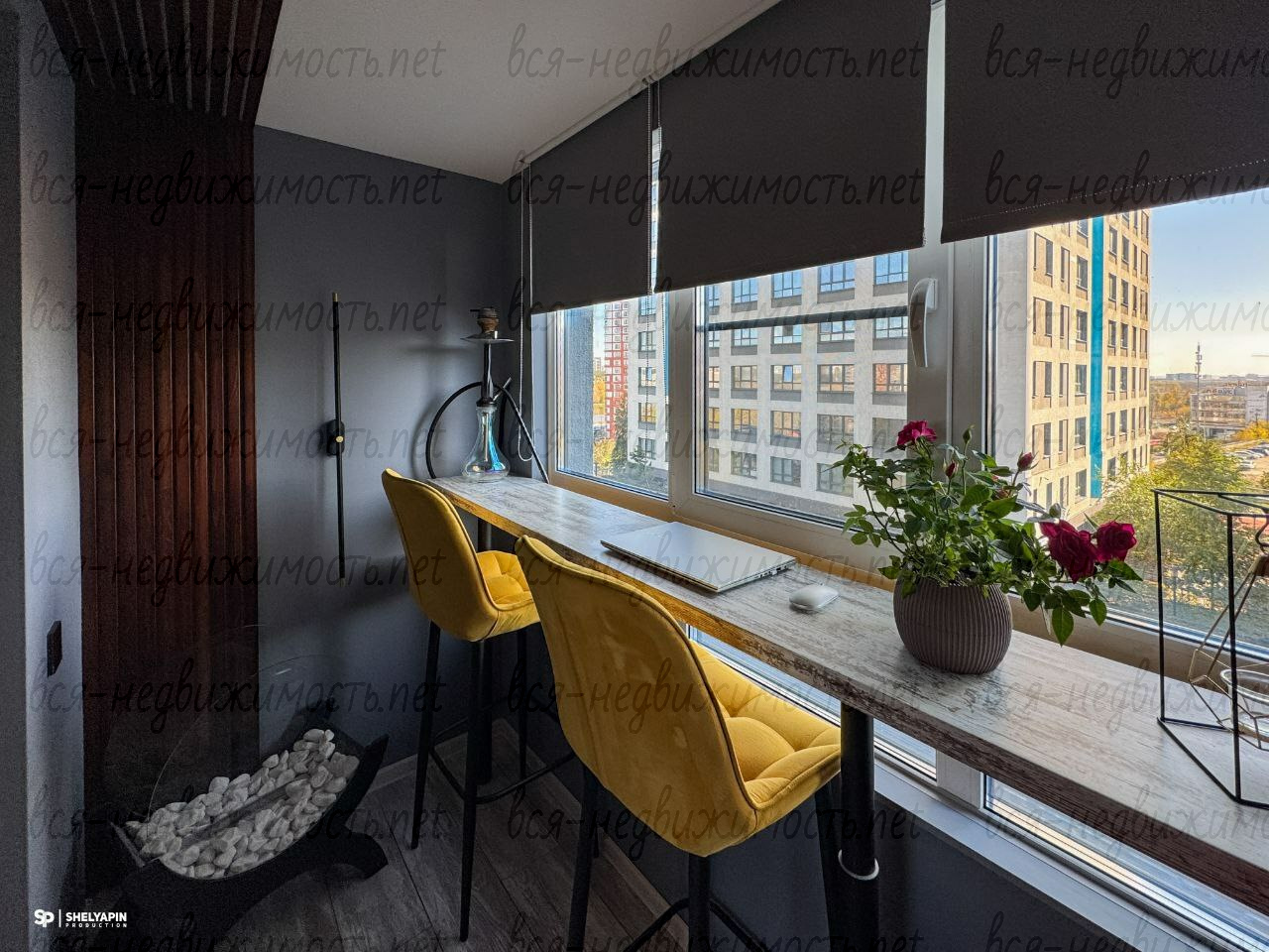 ✔ на теплом балконе барная стоика, барные стулья, раскладной диван, камин.