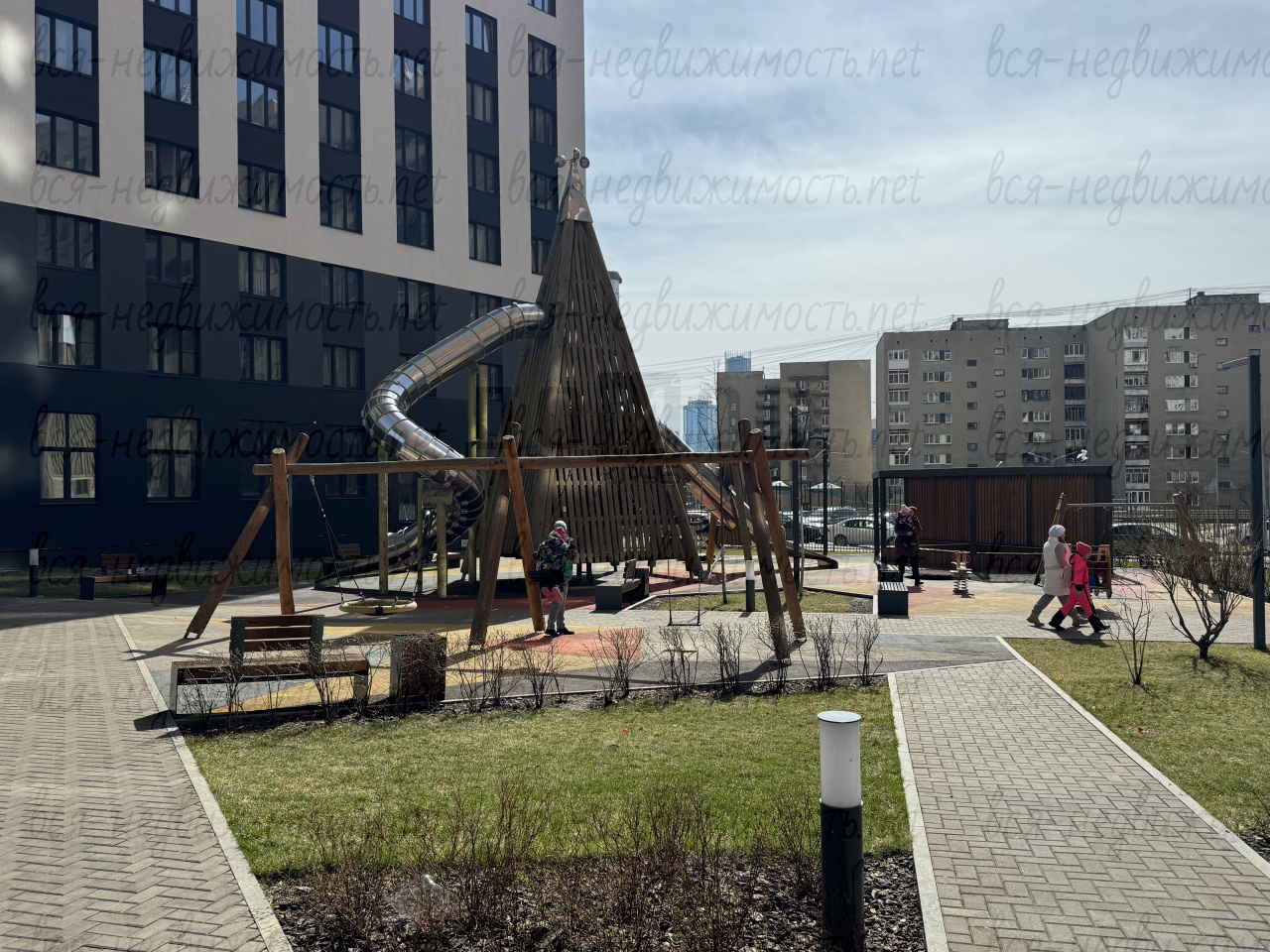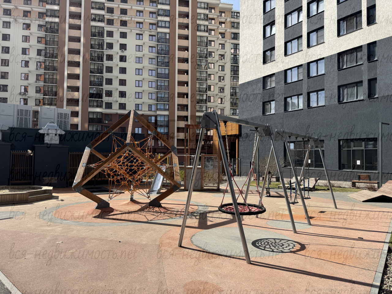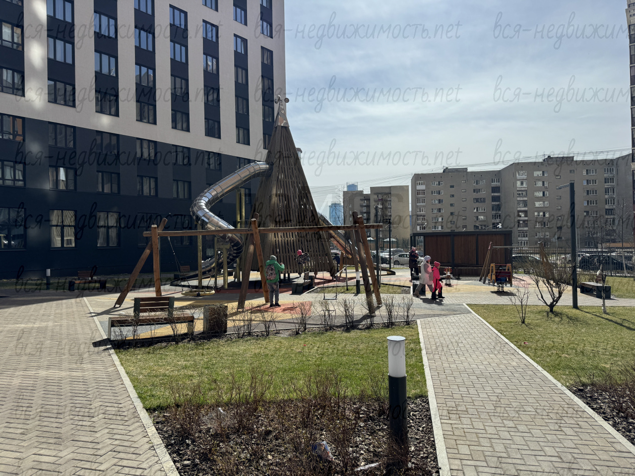 Современная дворовая территория с зонами для спорта, отдыха и детских площадок. Ландшафтное озеленение, видеонаблюдение по всей территории ЖК.