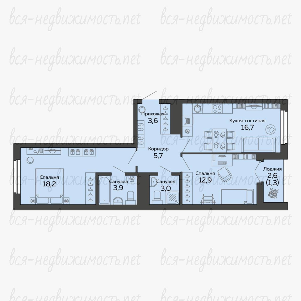 Планировка состоит из: коридора, кухни-гостиной, санузла с душевой, комнаты с лоджией и мастер-спальни (второй санузел в комнате).