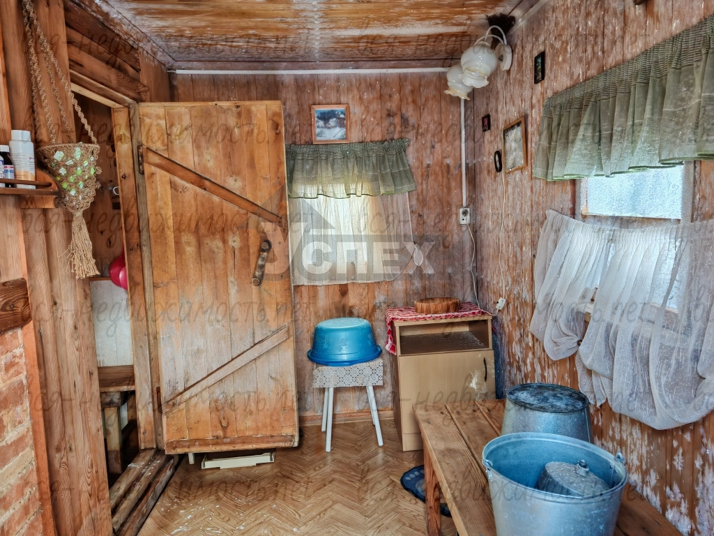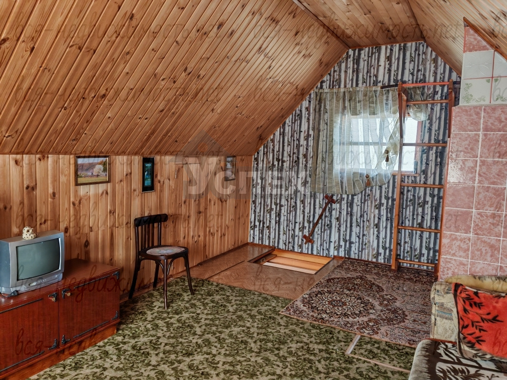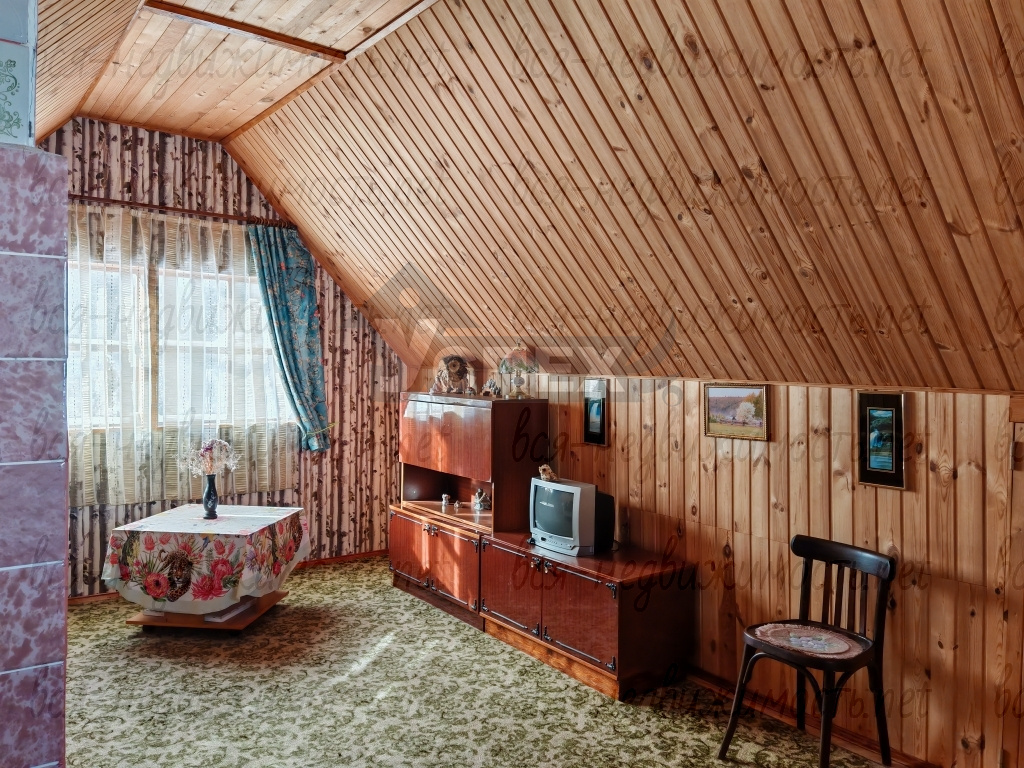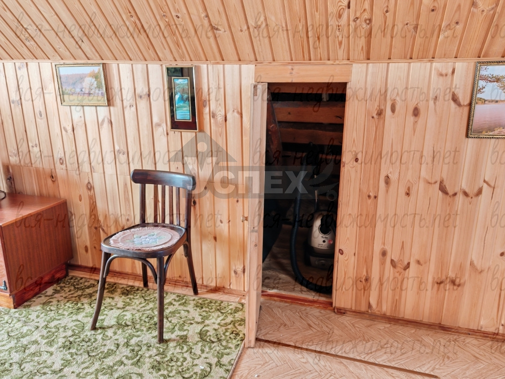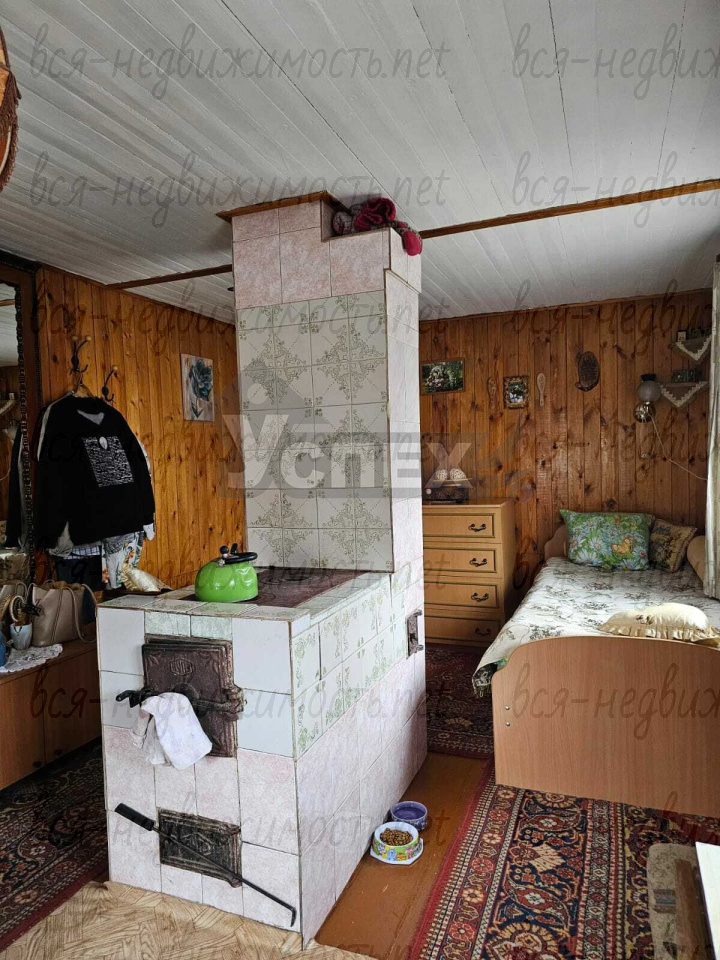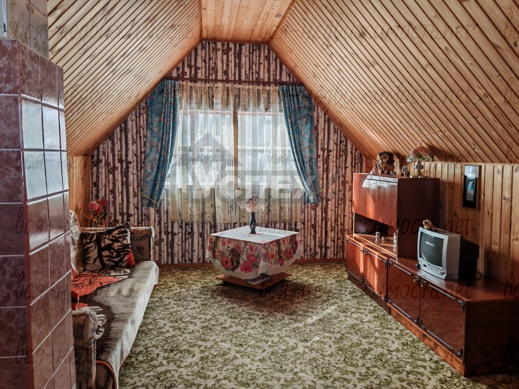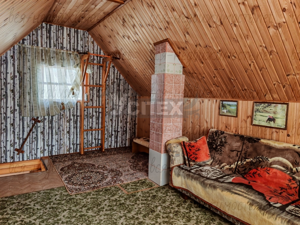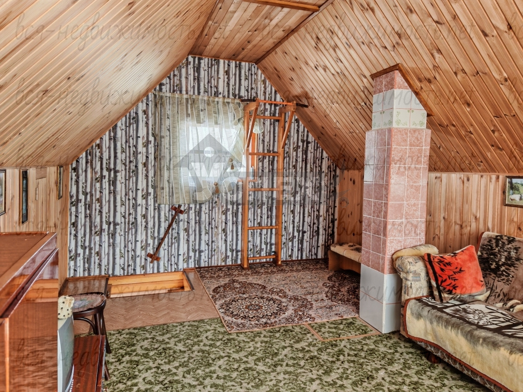 Дом 2-х этажный, материал стен - брус. Внутри обшит евровагонкой. На первом этаже светлая веранда с лестницей на второй этаж. В самом доме печное отопление.