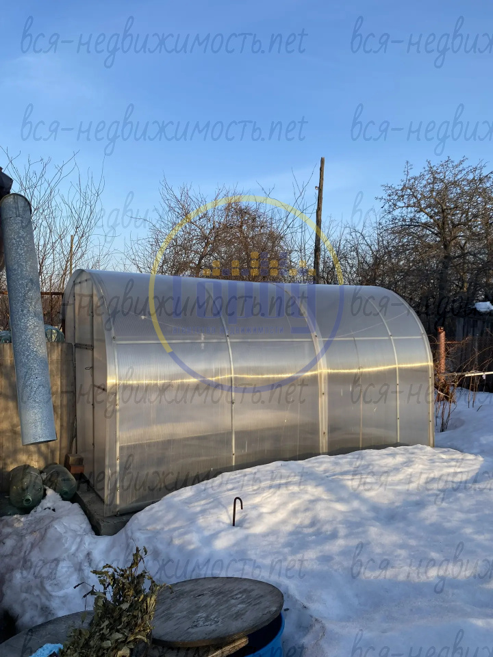 На территории: большой железный бак, 7 закопанных бочек для воды, мангальная зона, дровник, два хозблока для инструментов, прочные две теплицы, парник из поликарбоната.