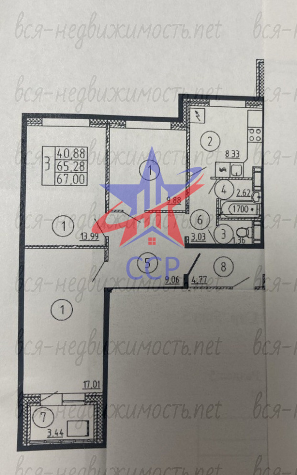 Общая площадь квартиры 67,общая жилая площадь -65,4кв,жилая площадь-41кв,зал-17,2кв,спальня-10кв,другая спальня -14 кв,кухня-8,5кв,прихожая -9кв,лоджия -3,5.