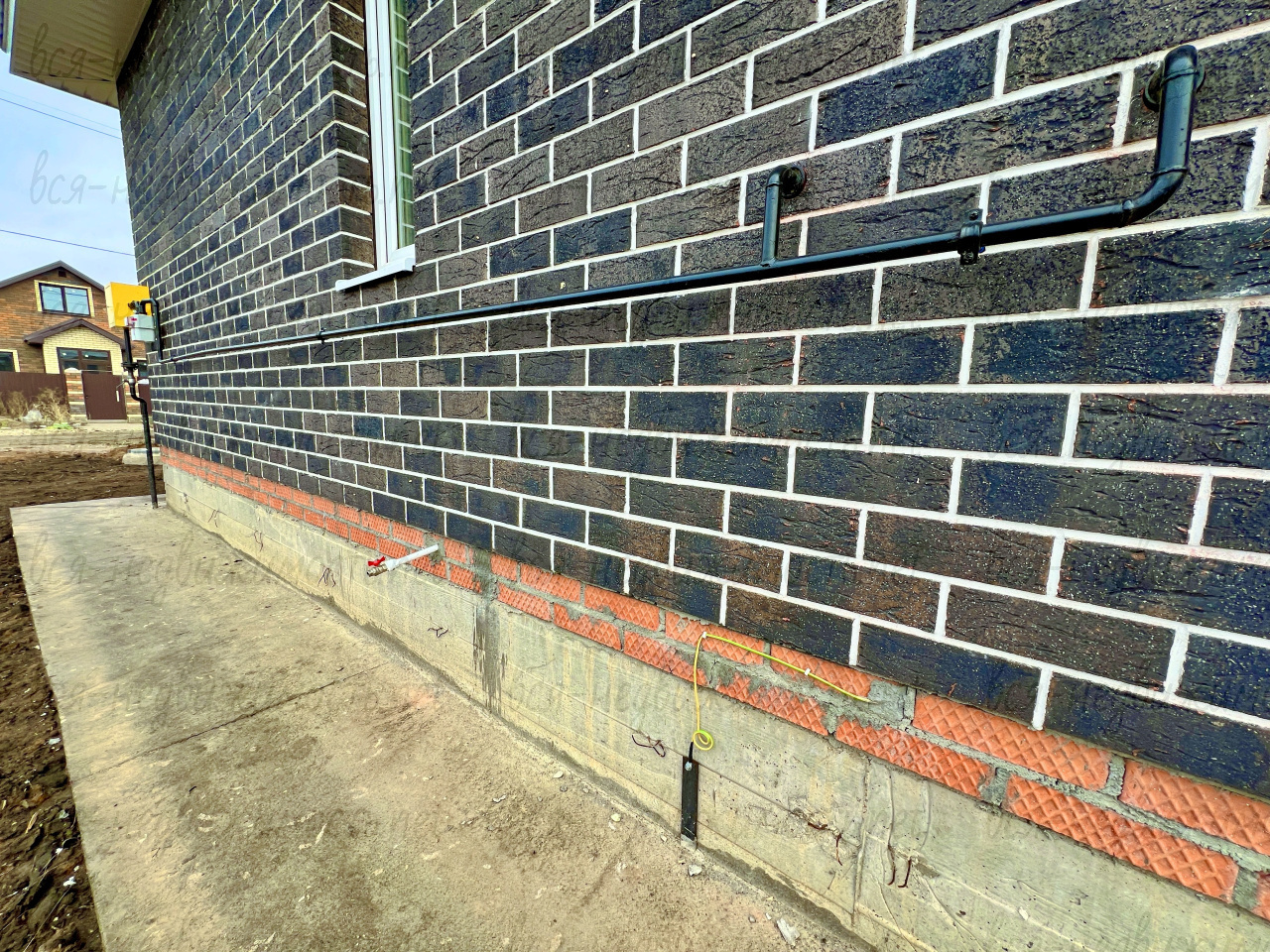 Стены: керамзитоблок 20 утеплитель 10 см, облицовочный кирпич, отмостка, дорожка до крыльца.