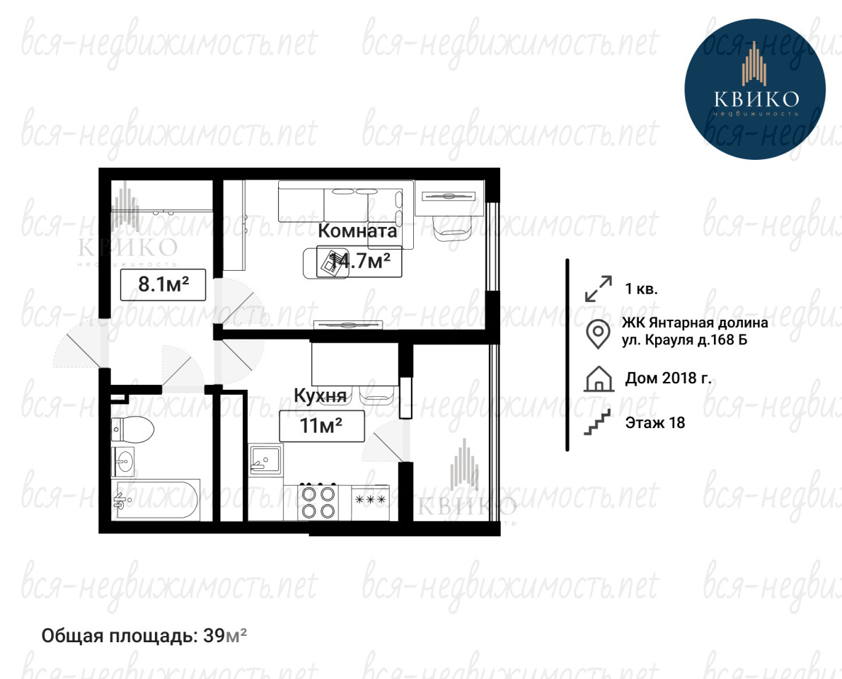 - общая площадь 39 м2, кухня 11 м2, комната - 14,7 м2, балкон