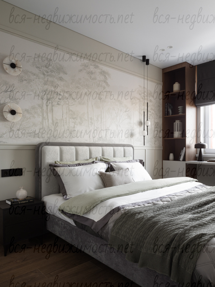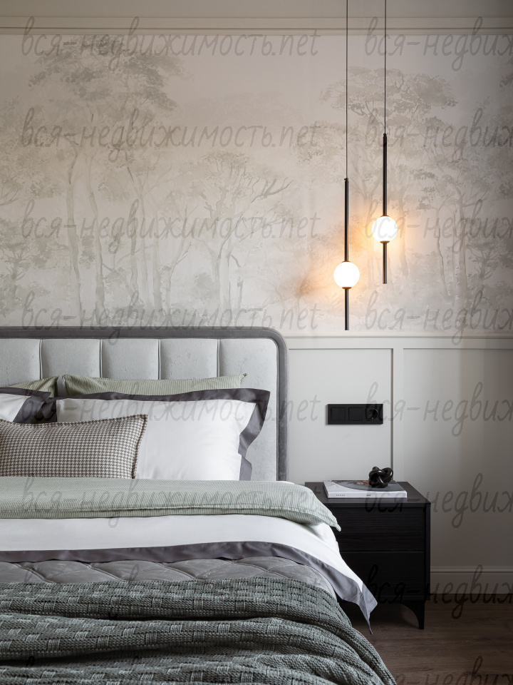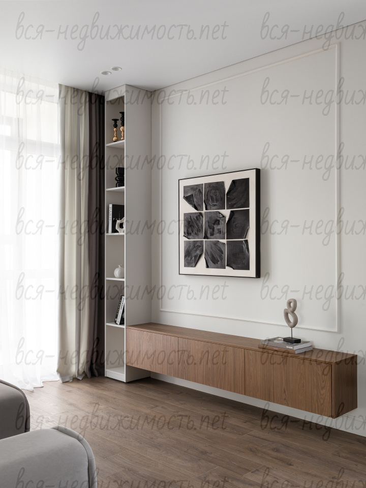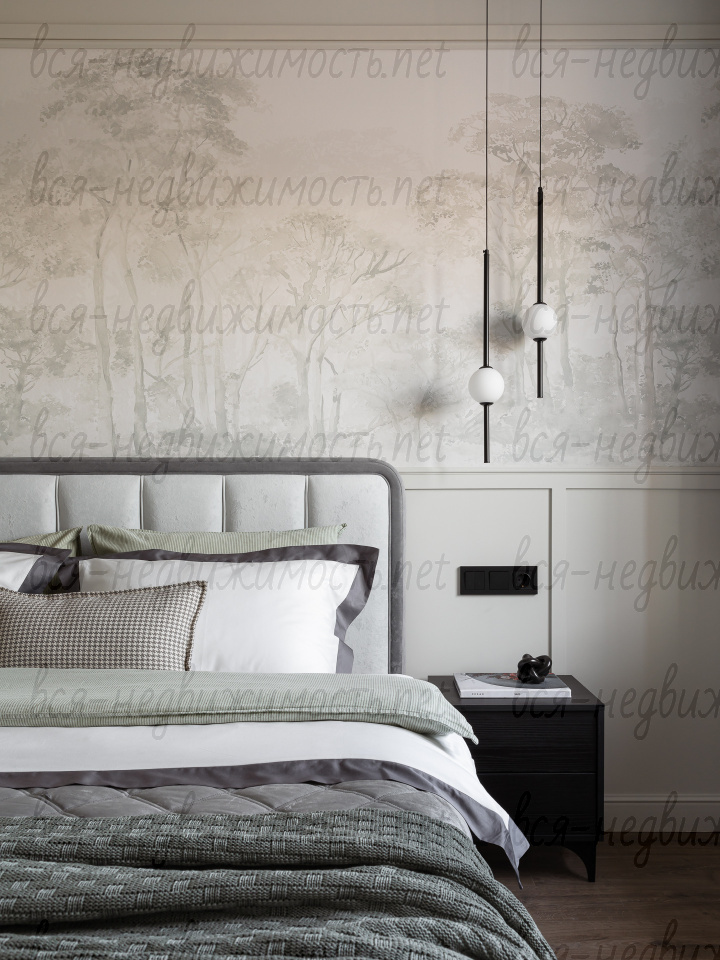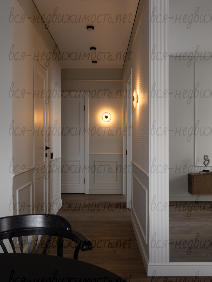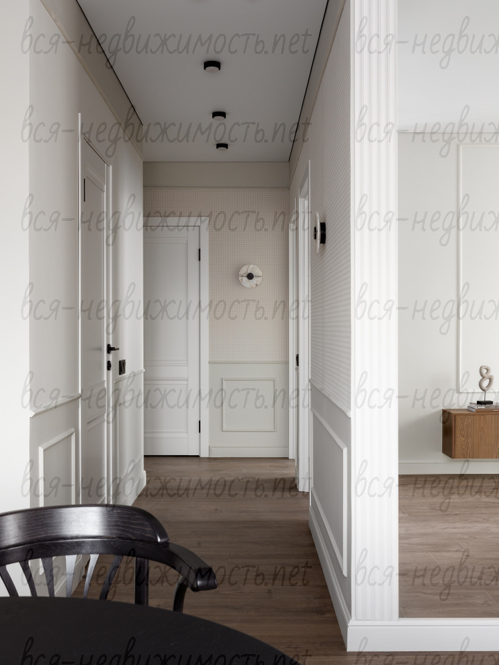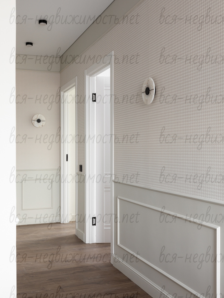 На полу - высококачественный водостойкий ламинат Quick Step высшего класса, в санузлах - крупноформатный керамогранит, теплый пол в ванной комнате, в изголовье кровати - выполненная под заказ фреска, все стены тщательно выровнены, наклеен стеклохолст и окрашены водостойкой моющейся краской. Акценты в коридоре и гостиной выделены в виде рельефных стен и специально подобранных обоев.