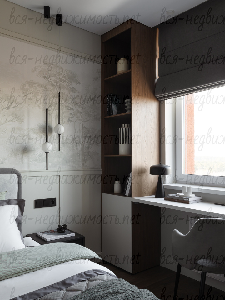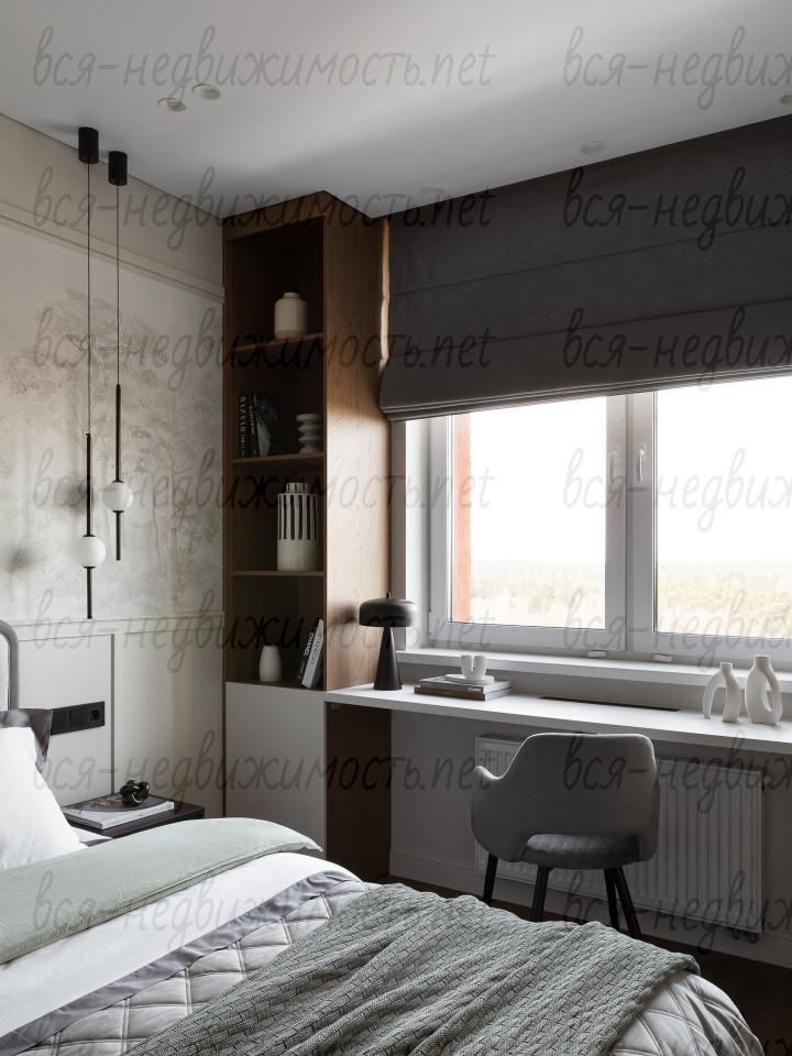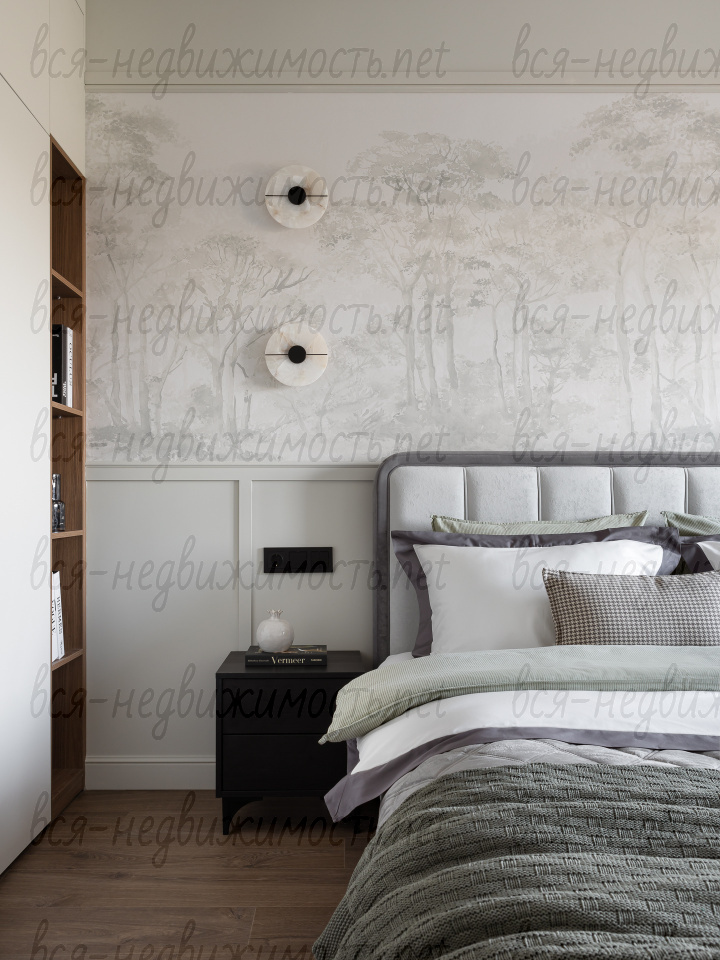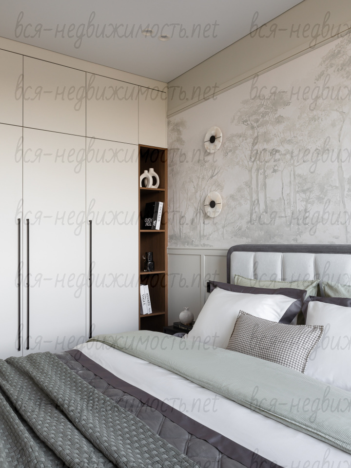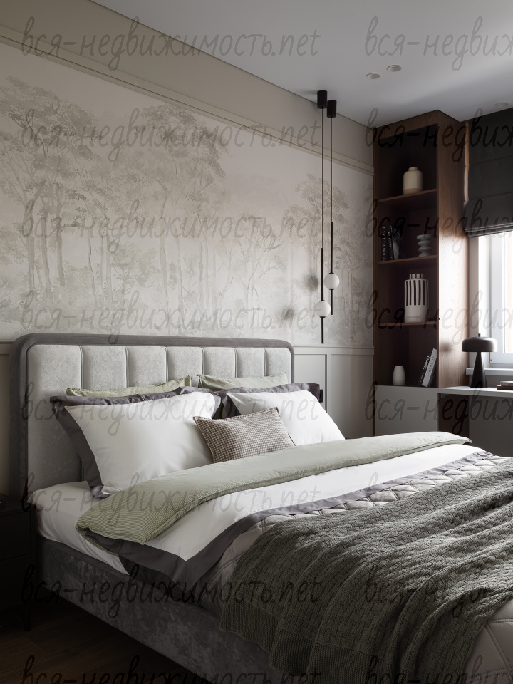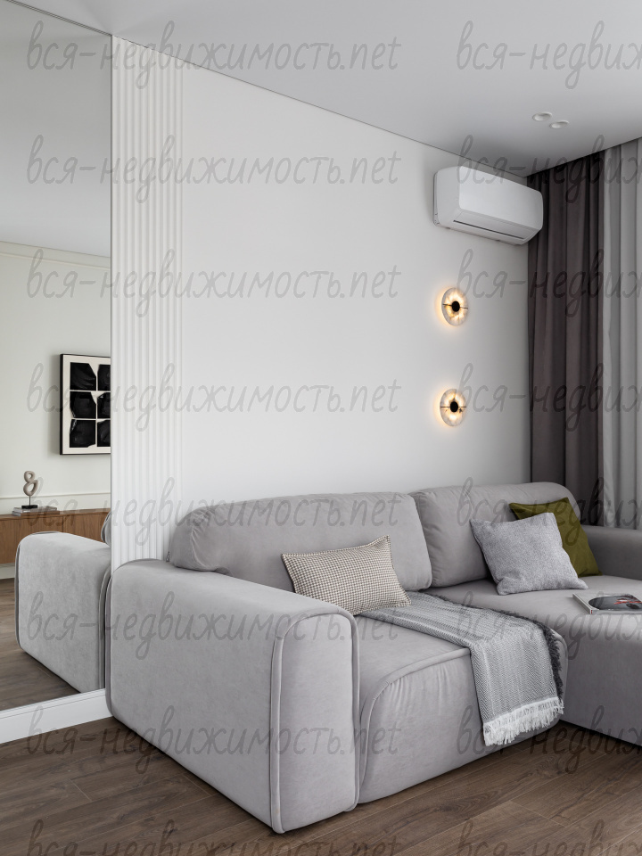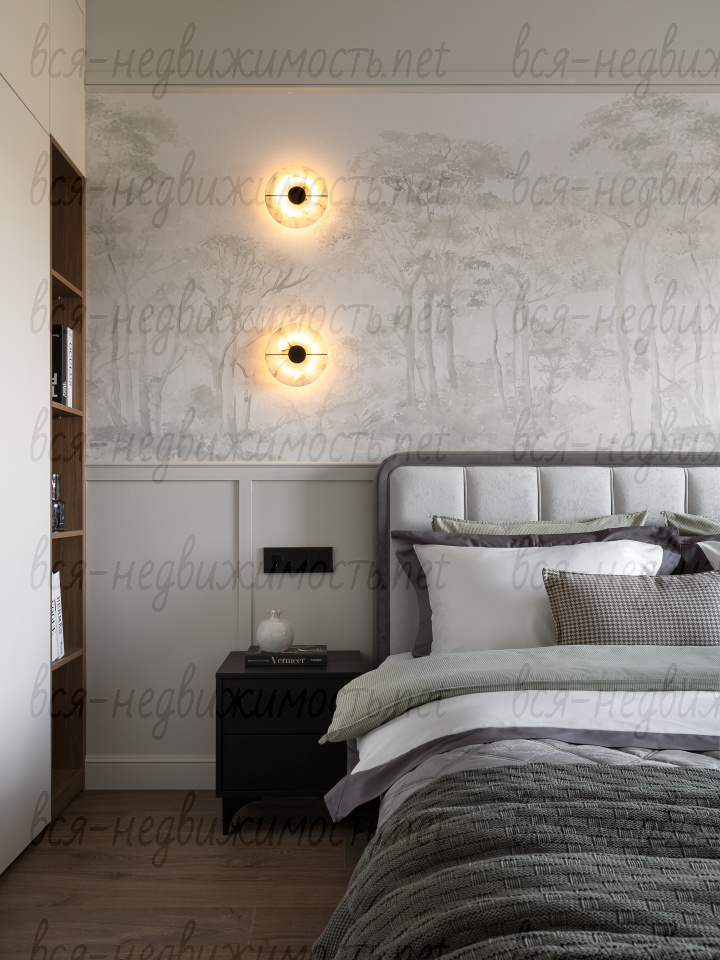 На полу - высококачественный водостойкий ламинат Quick Step высшего класса, в санузлах - крупноформатный керамогранит, теплый пол в ванной комнате, в изголовье кровати - выполненная под заказ фреска, все стены тщательно выровнены, наклеен стеклохолст и окрашены водостойкой моющейся краской. Акценты в коридоре и гостиной выделены в виде рельефных стен и специально подобранных обоев.