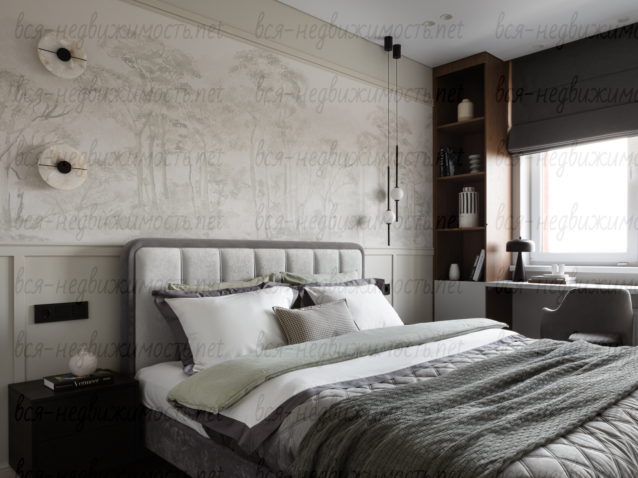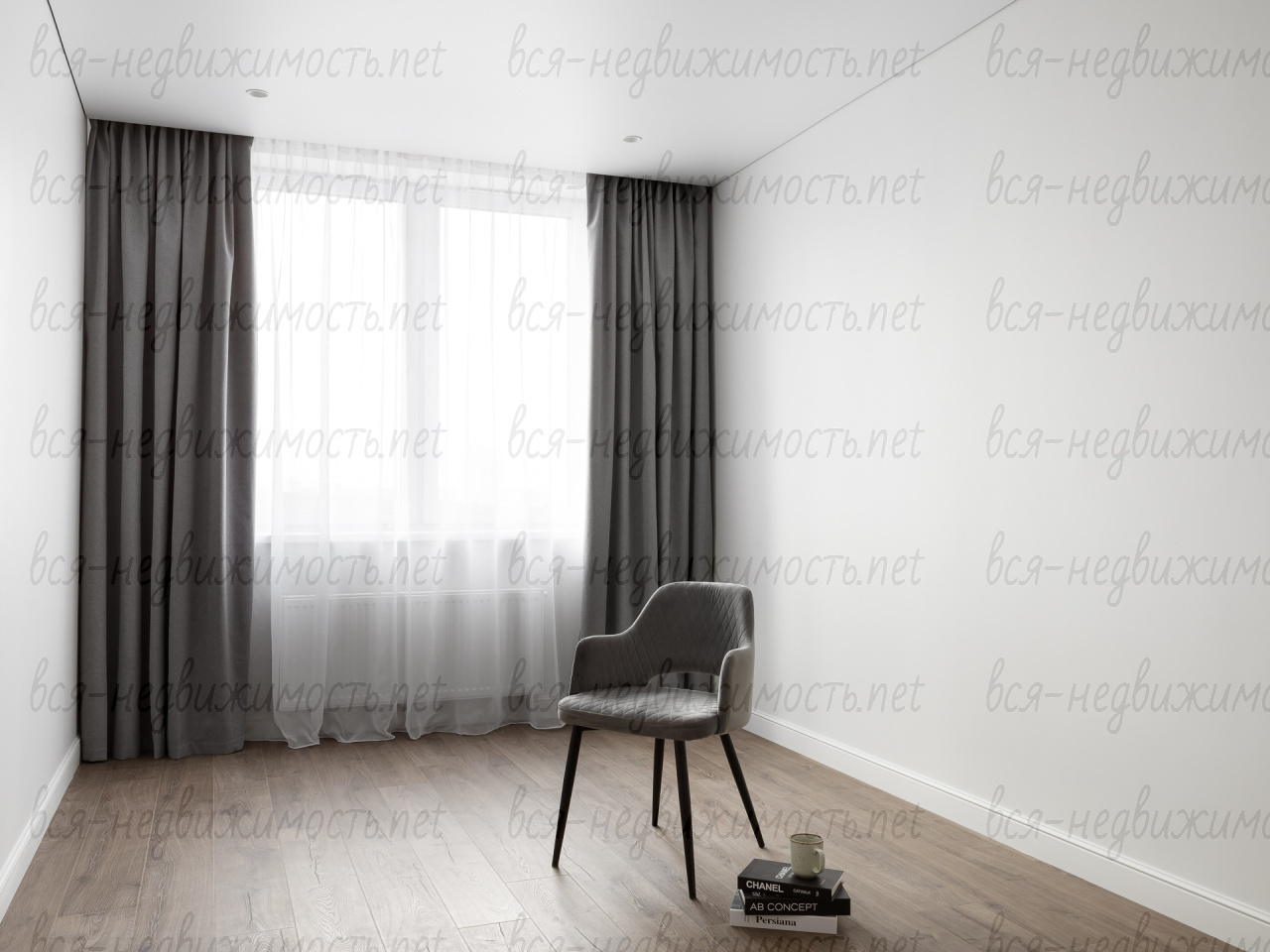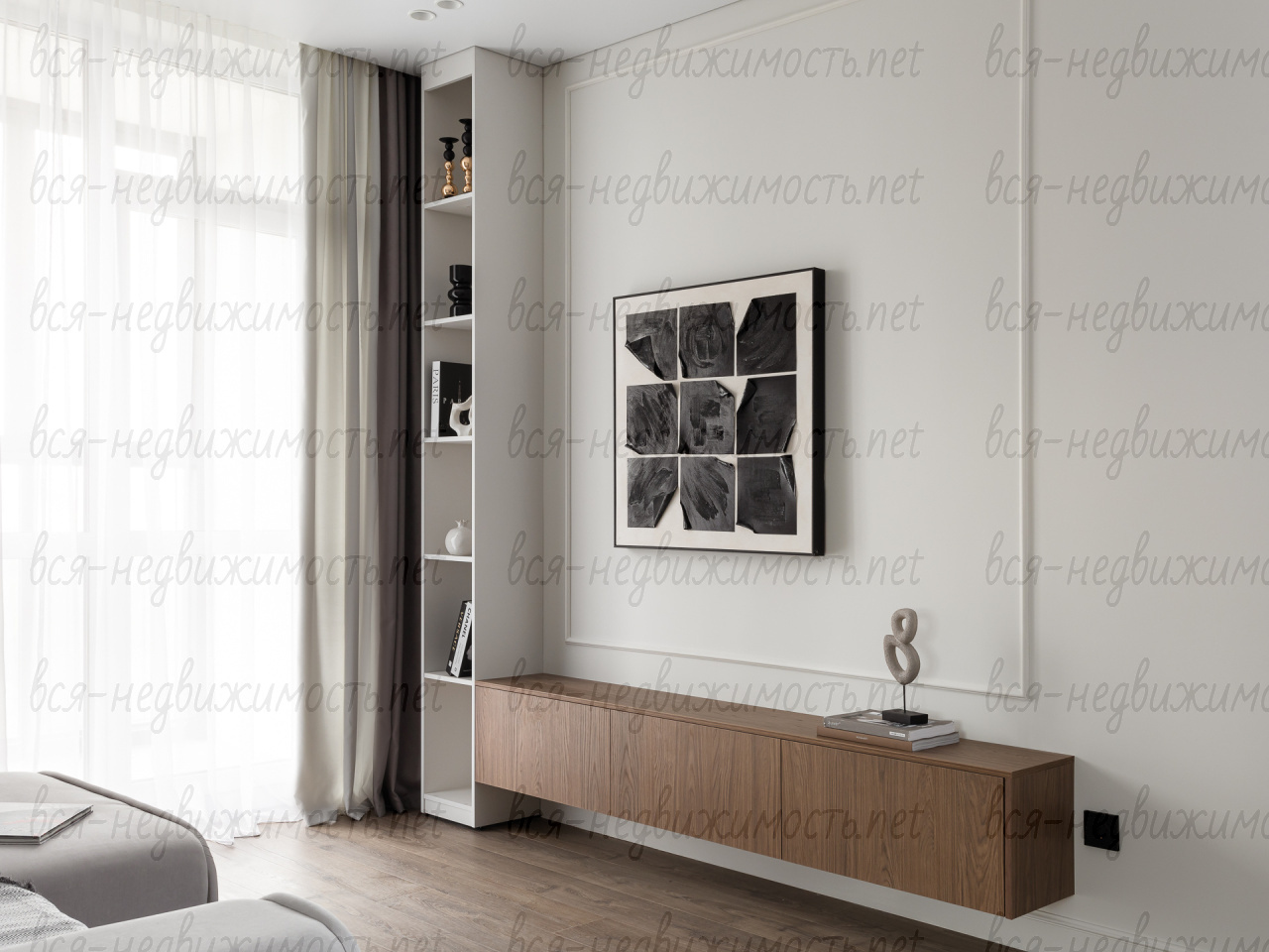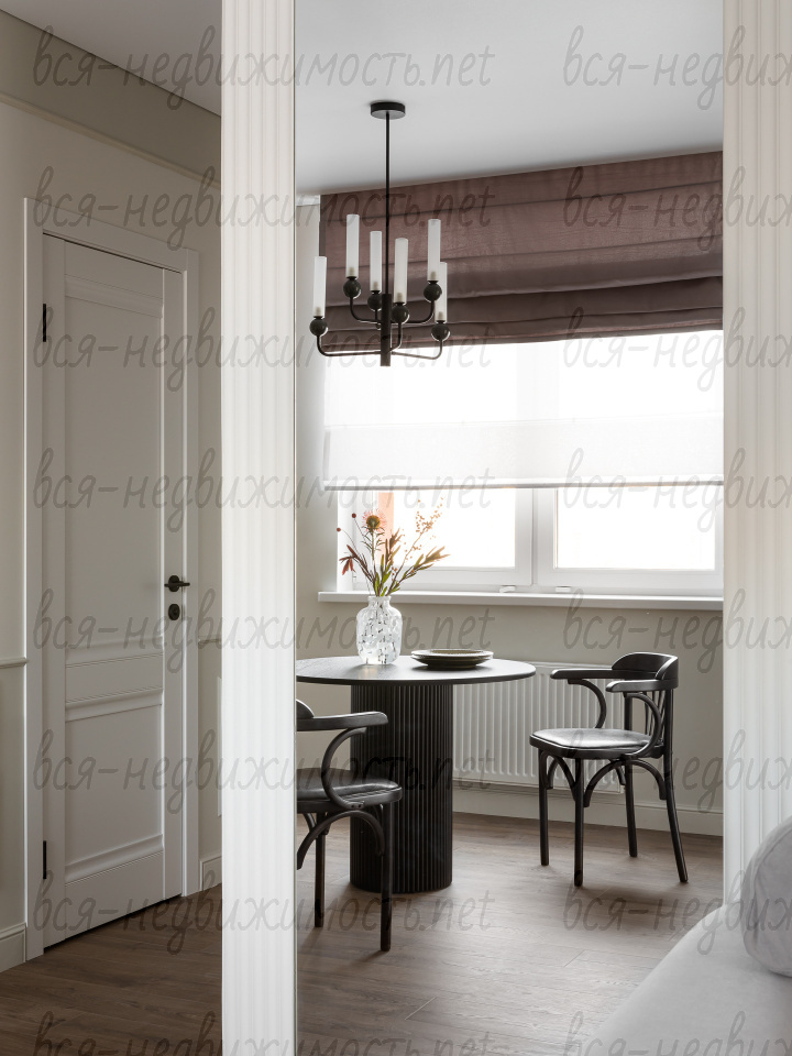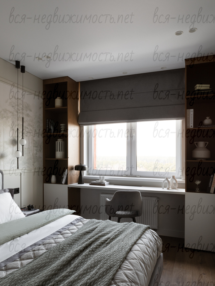 На полу - высококачественный водостойкий ламинат Quick Step высшего класса, в санузлах - крупноформатный керамогранит, теплый пол в ванной комнате, в изголовье кровати - выполненная под заказ фреска, все стены тщательно выровнены, наклеен стеклохолст и окрашены водостойкой моющейся краской. Акценты в коридоре и гостиной выделены в виде рельефных стен и специально подобранных обоев.