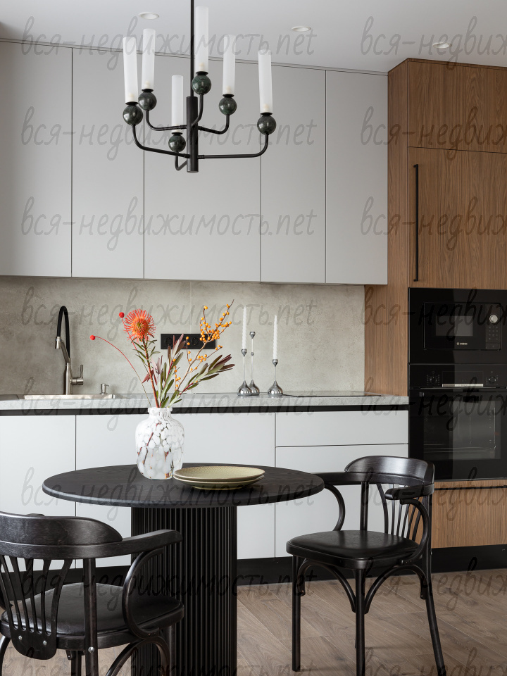 На кухне встроенный гарнитур из МДФ с фурнитурой Hettich, подходящий по стилю к остальной квартире, со всей встроенной техникой - холодильник, микроволновка и духовка Bosсh, посудомоечная машина, вытяжка, варочная панель.