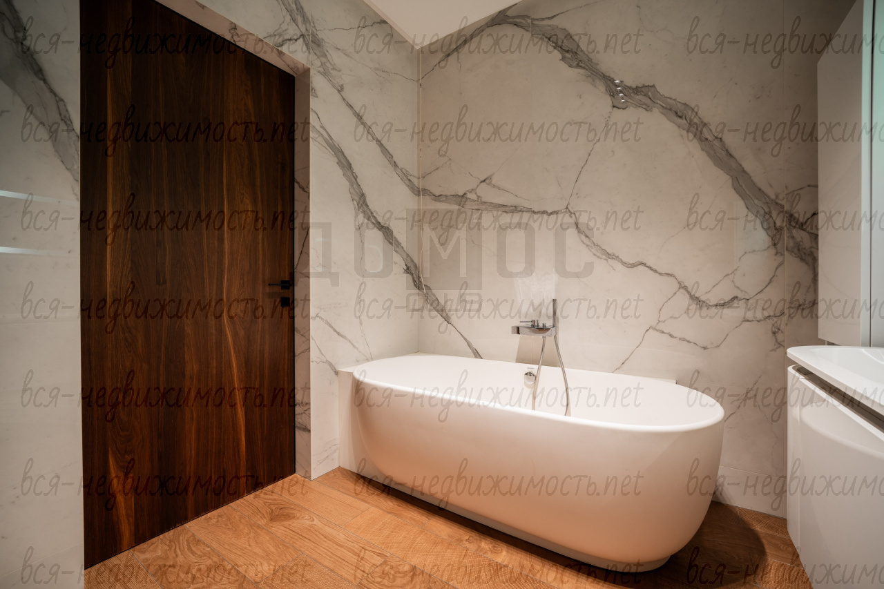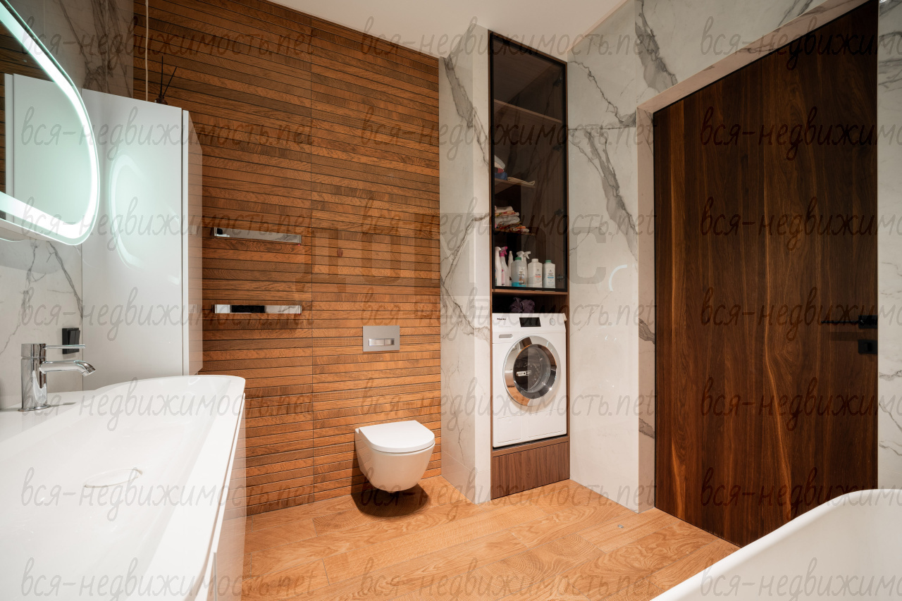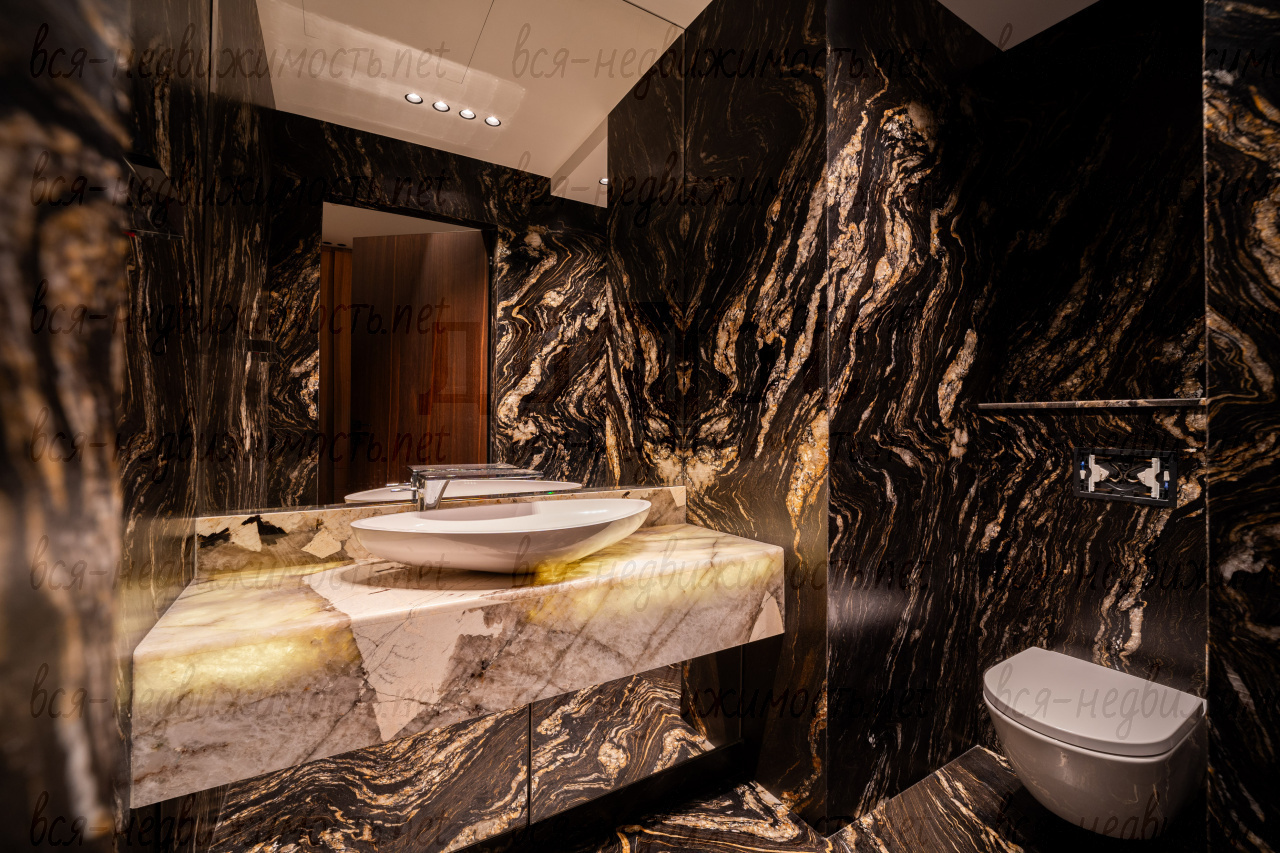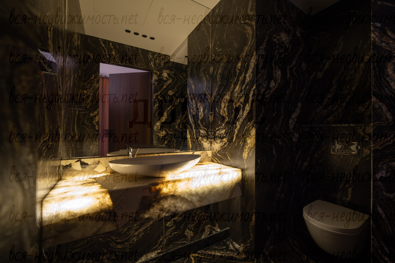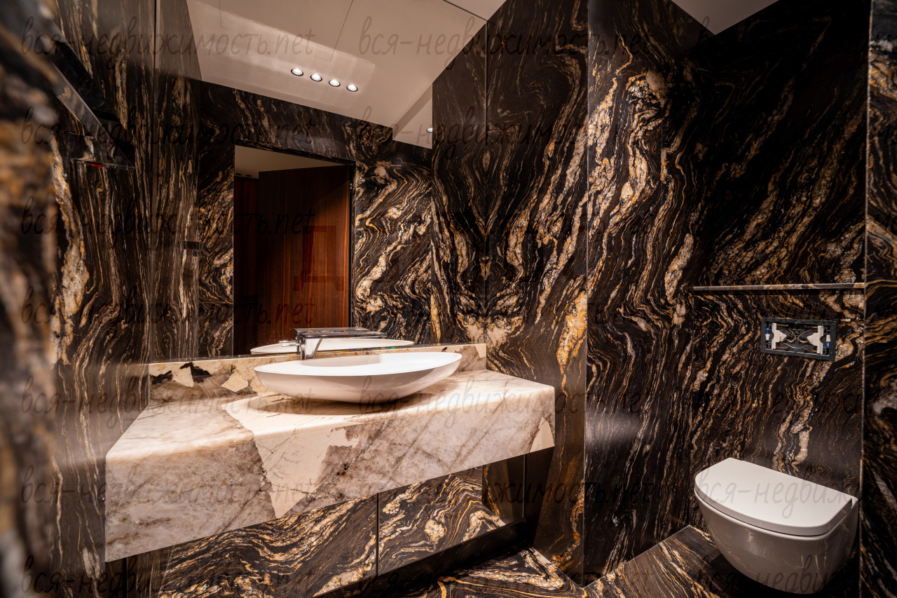 Три санузла. Гостевой - полностью отделан мрамором. Два других - крупноформатный керамогранит премиальных коллекций. Сантехника из Германии, двери — Италия.