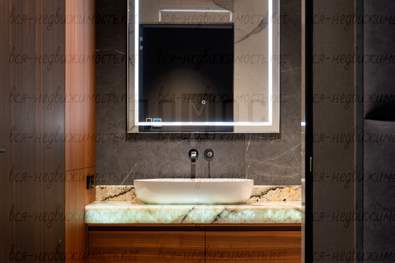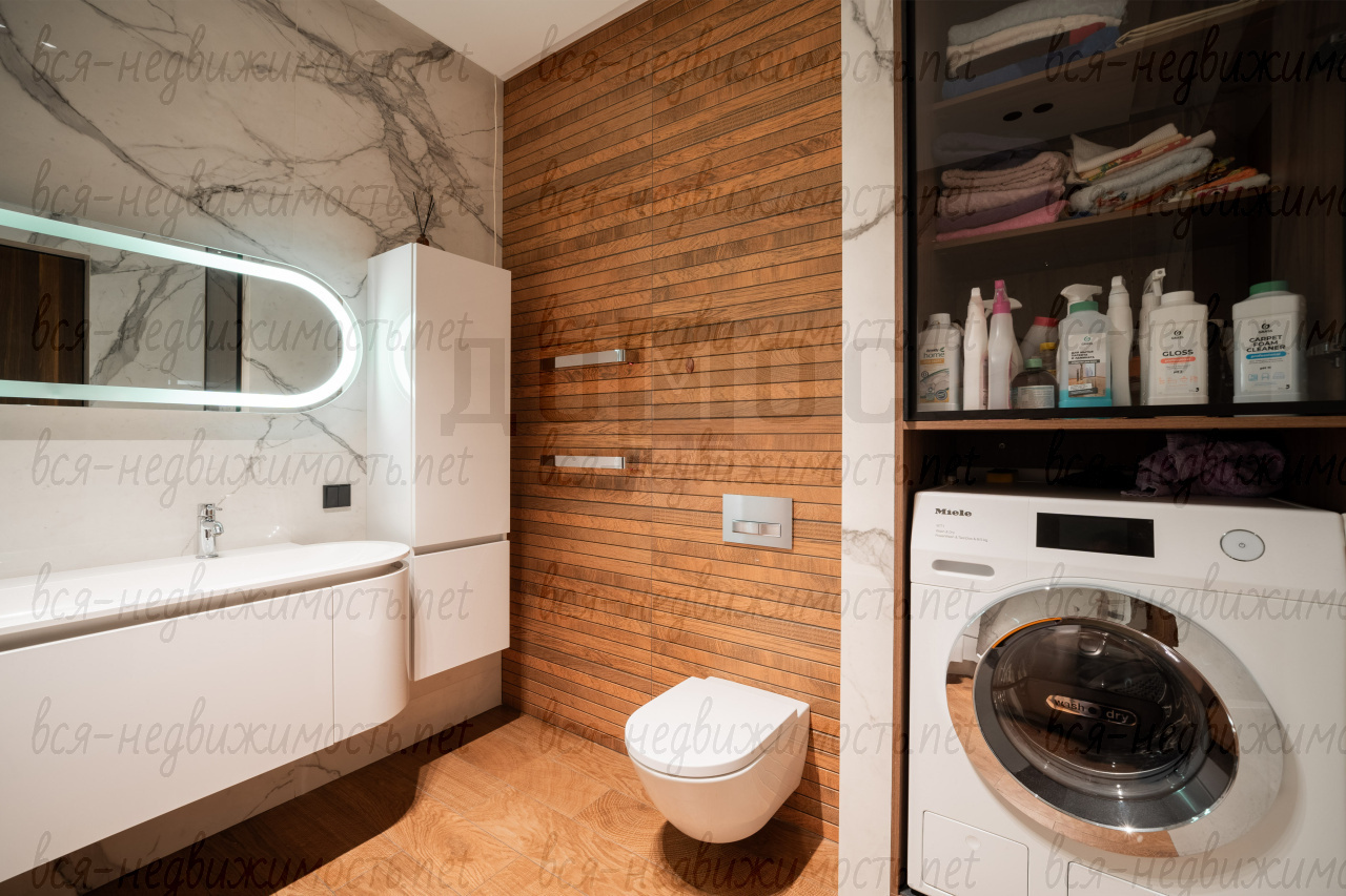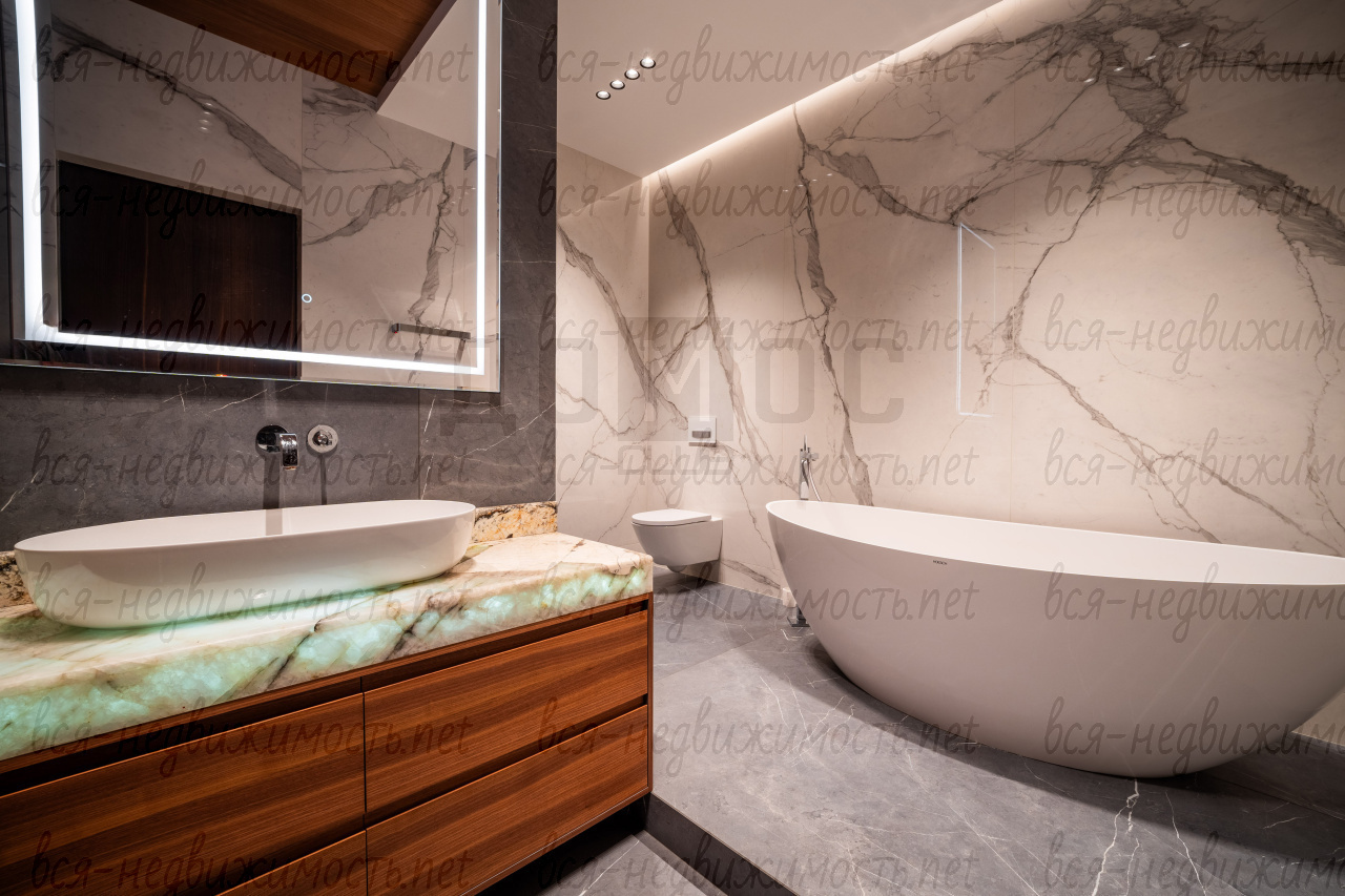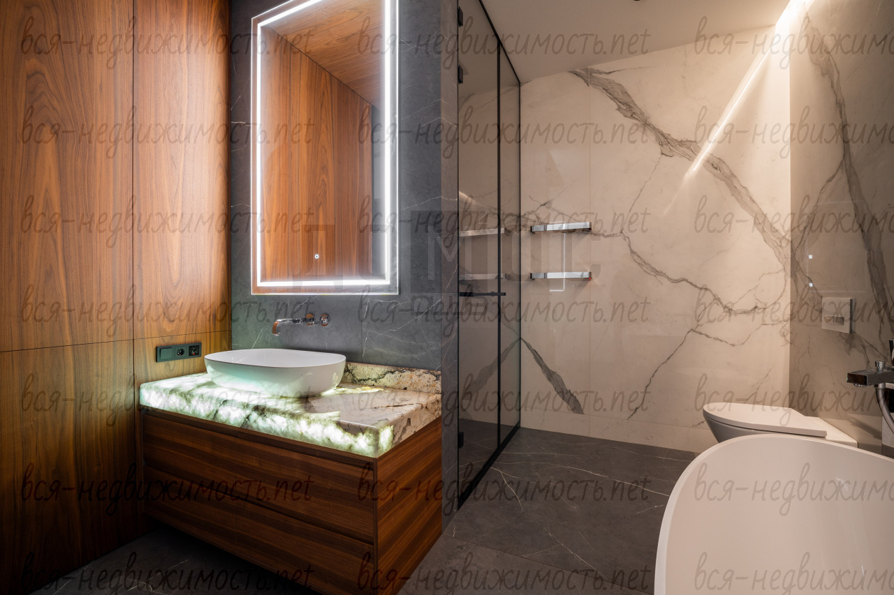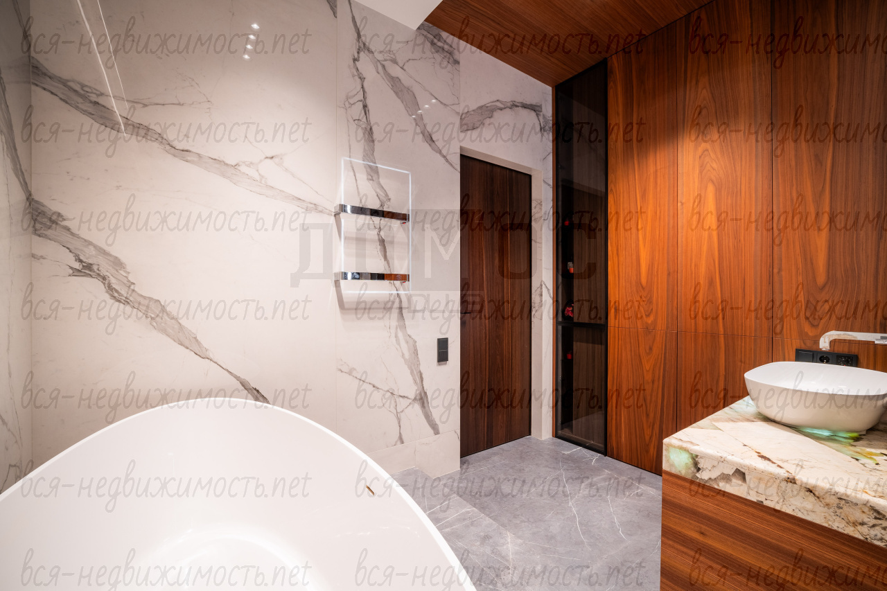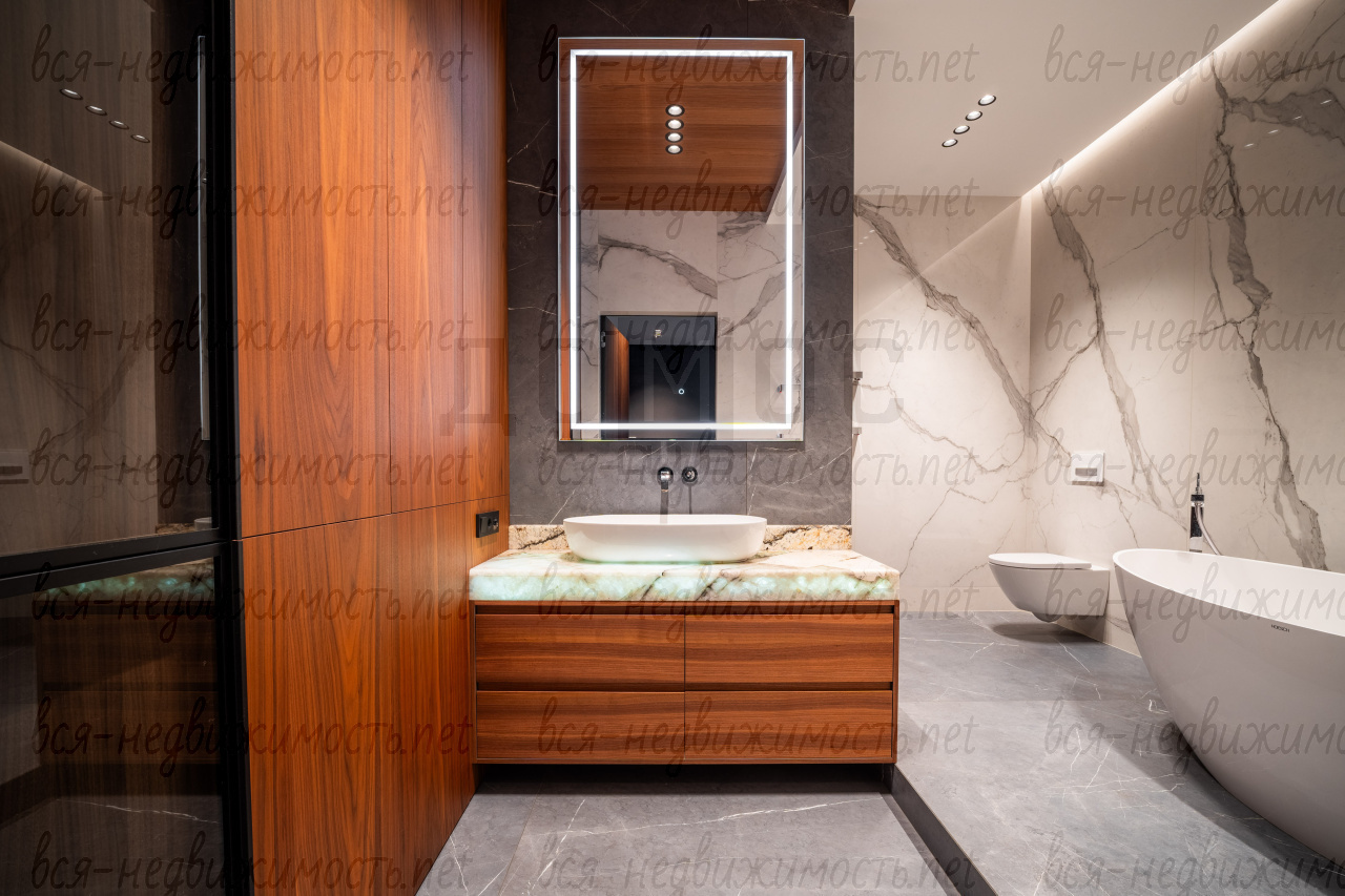Три санузла. Гостевой - полностью отделан мрамором. Два других - крупноформатный керамогранит премиальных коллекций. Сантехника из Германии, двери — Италия.