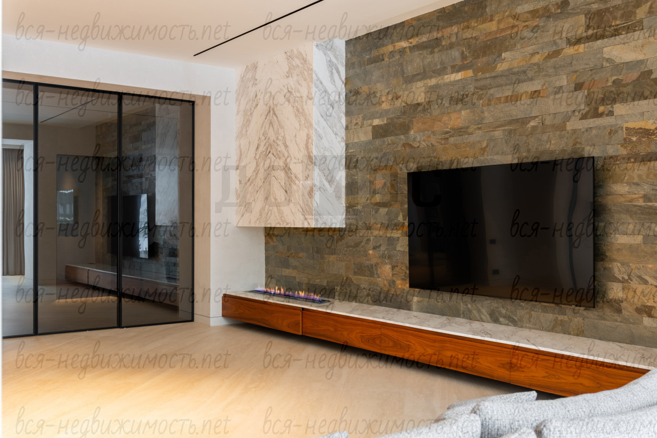 Кухня-гостиная 79,4 кв.м. — это почти 80 метров свободы для жизни и приема гостей. Настоящий итальянский биокамин и мраморная отделка над ним создают атмосферу дорогого загородного лоджа.