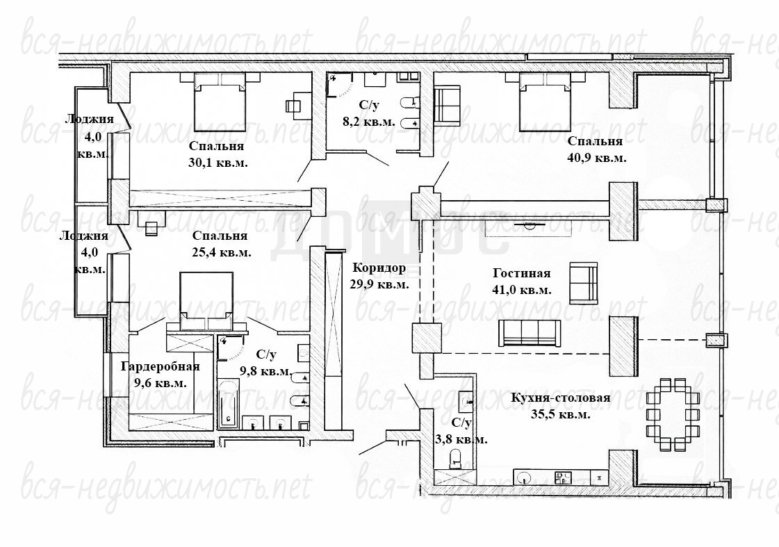Три полноценных комнаты (40.9, 25.4 и 30.1 кв.м) — каждая из которых по размеру сопоставима с отдельной квартирой.